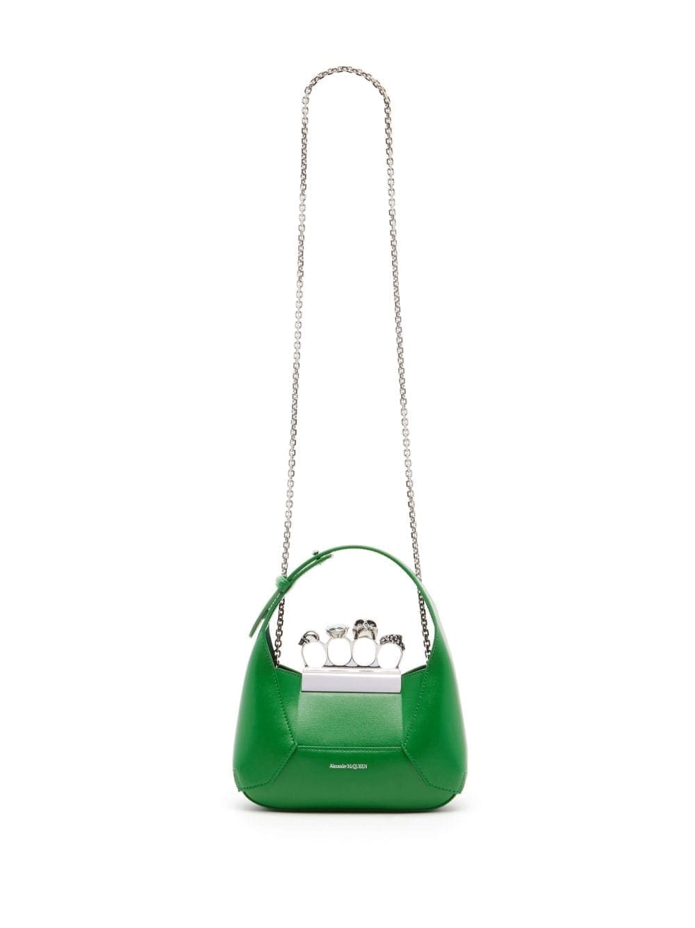 Crafted from calf leather, this Jewelled Hobo tote is an instantly recognisable Alexander McQueen accessory thanks to the signature four-ring handle that's embellished with skulls and Swarovski crystals. The green-hued bag features leather panels that are cut and reassembled together.