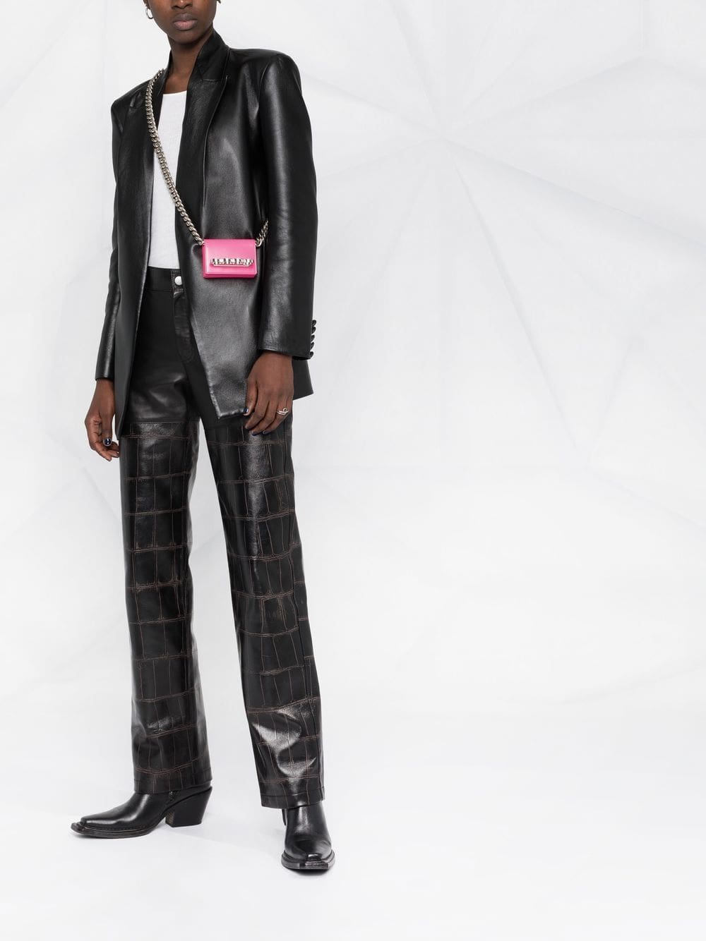Alexander McQueen enlists their signature knuckleduster motif with this Four Ring mini bag for SS22. Fabricated in Italy from hot pink leather, the compact silhouette features complimentary silver-tone hardware and a partitioned internal compartment.