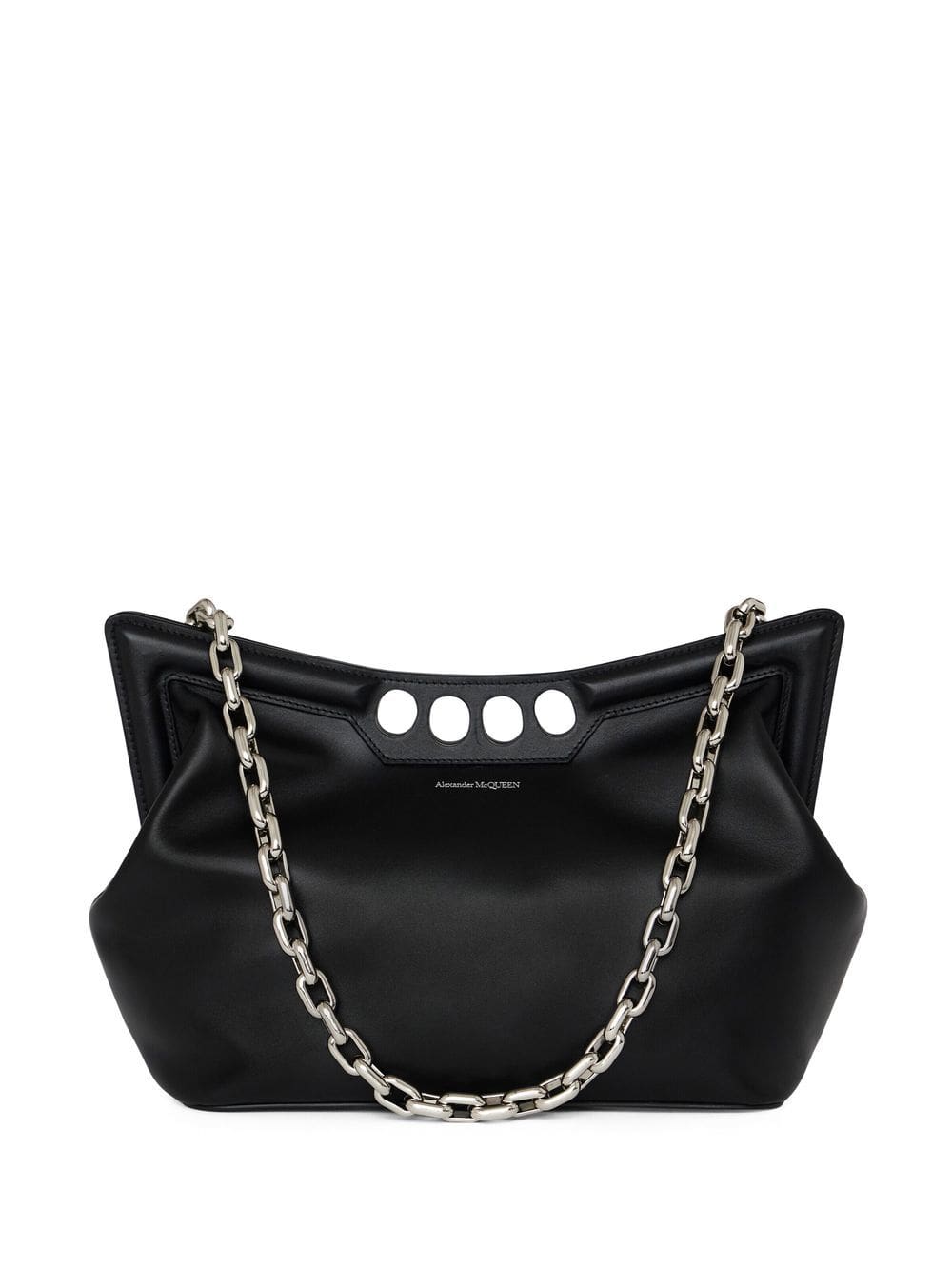 Inspired by the sharp structured shoulders of the sartorial silhouettes of Alexander McQueen, this Peak shoulder bag features a curved magnetic frame handcrafted from calf leather. The lower half of the design falls to a soft slouchy body, displaying the designer's penchant for juxtapositions.