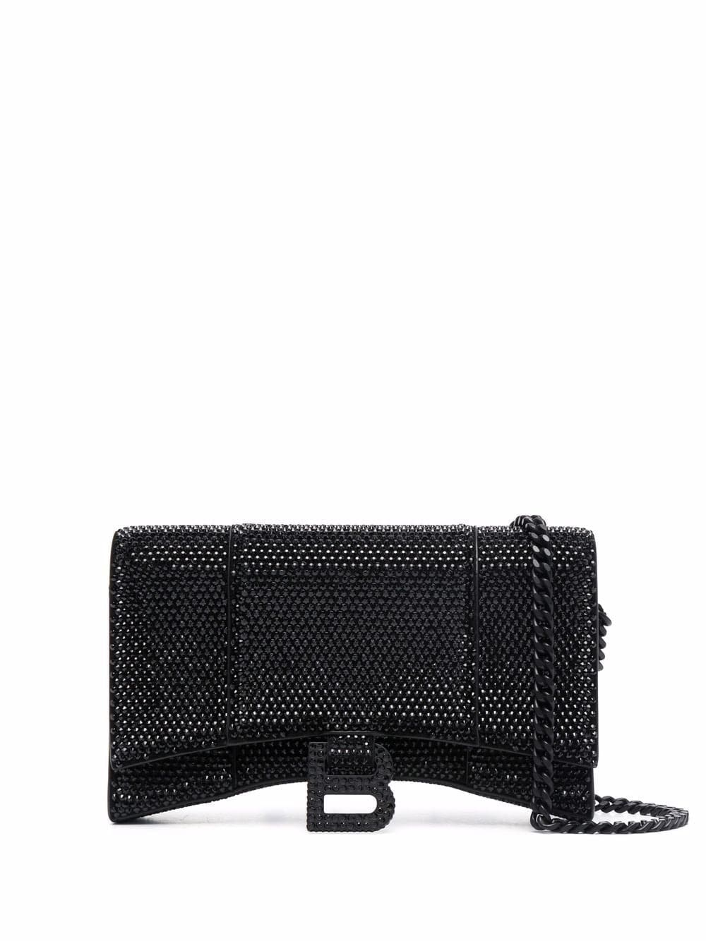 First launched in 2019, the Hourglass bag has become an iconic Balenciaga hallmark. Made from calf leather, this popular silhouette has been given a modern update with an all-over crystal studded surface in a black tonal design and finished with the classic B-shaped logo to the front.