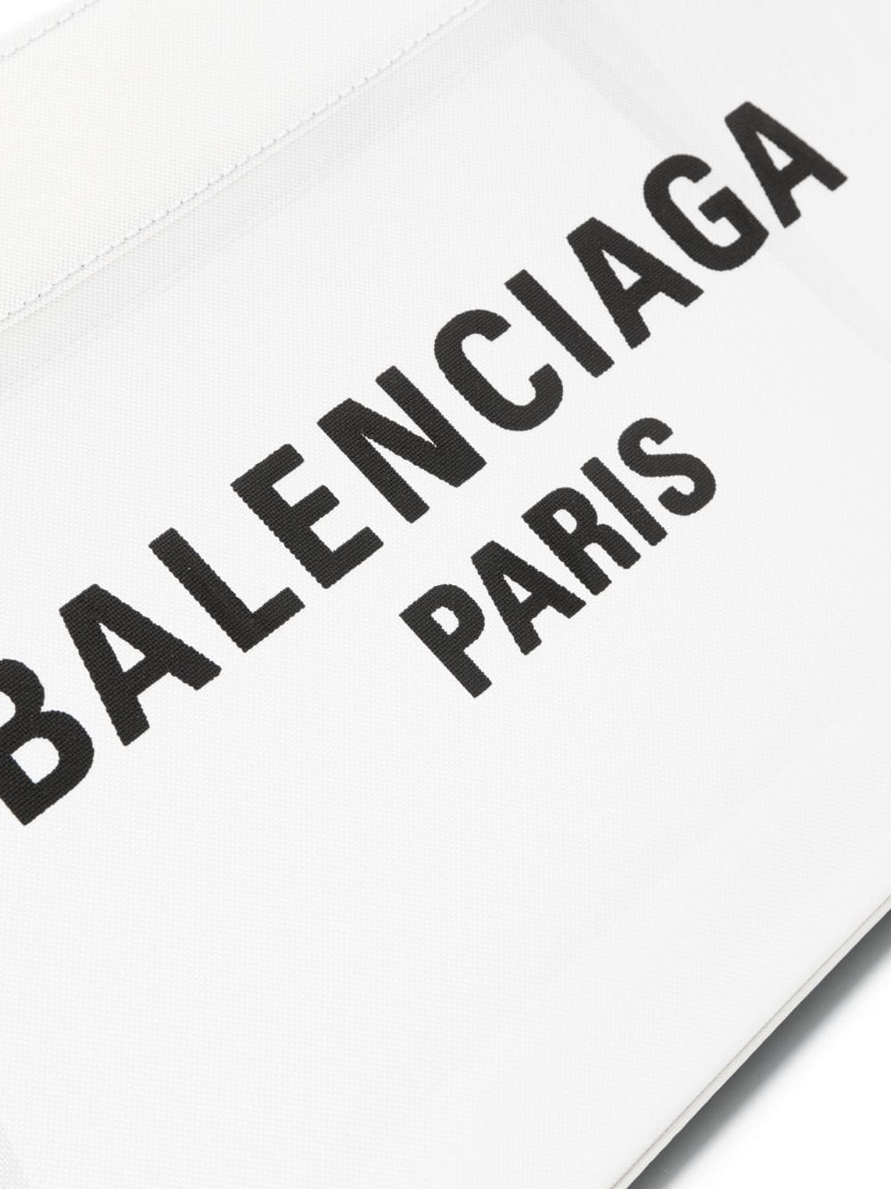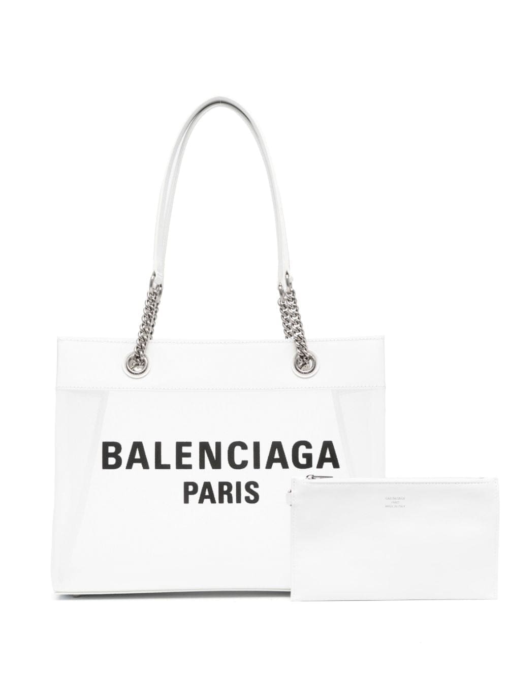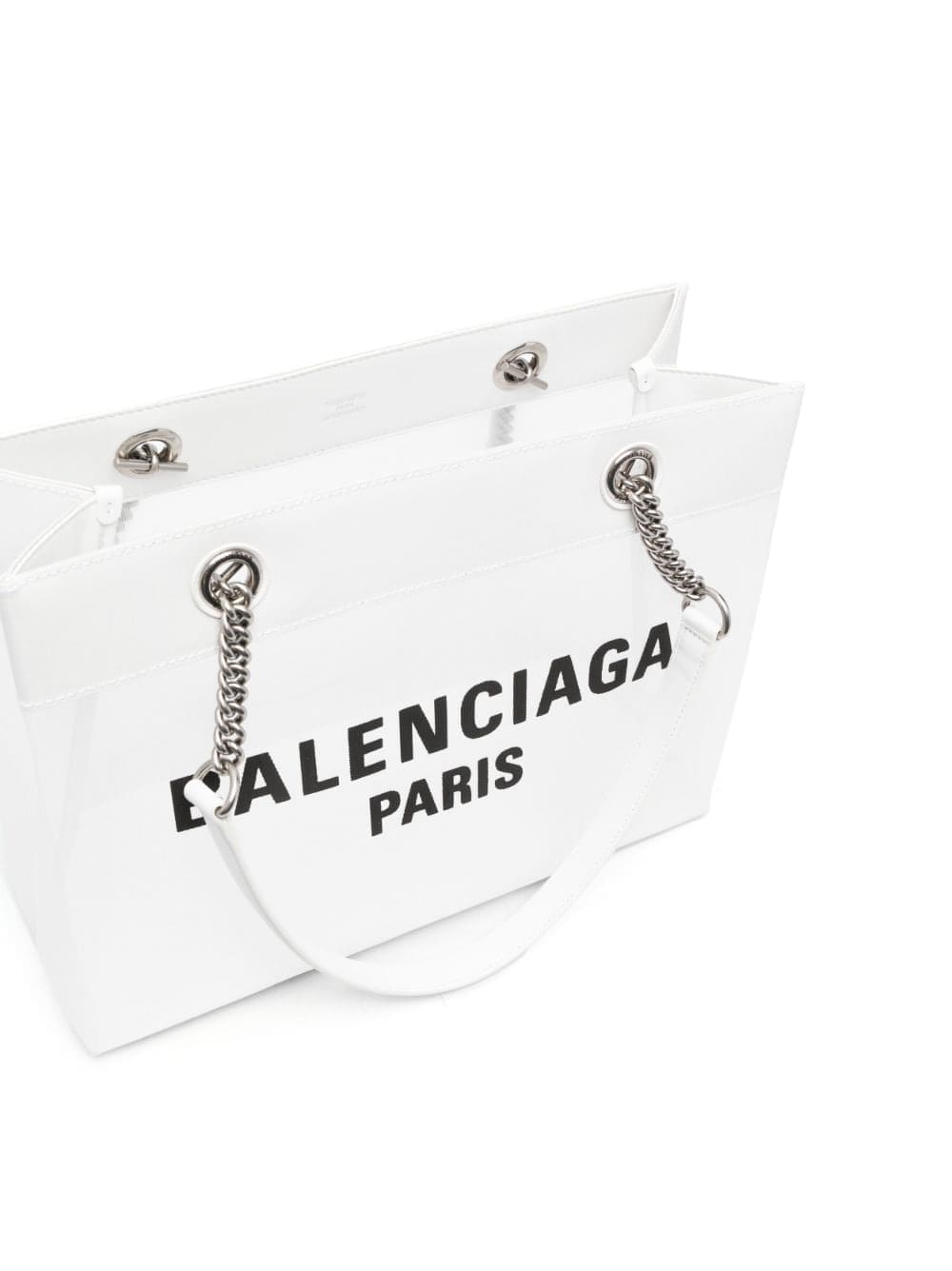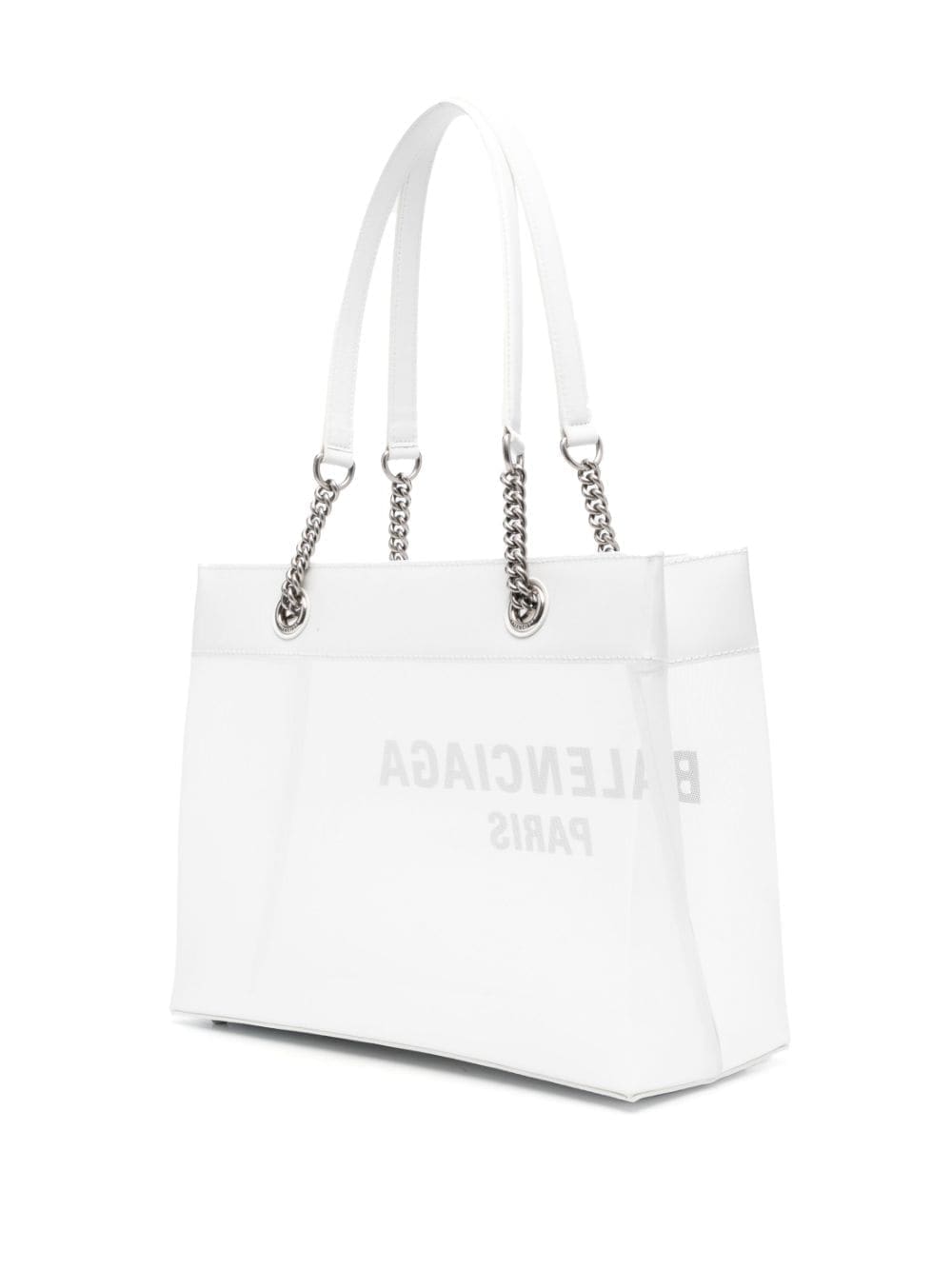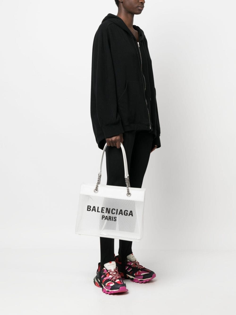 Featuring the iconic Balenciaga logo print to the front, this Duty Free mesh tote bag comes with an open top and a removable pouch. The aged-silver chain-link and leather handles merge with an industrial look to create one legitimate Balenciaga design.