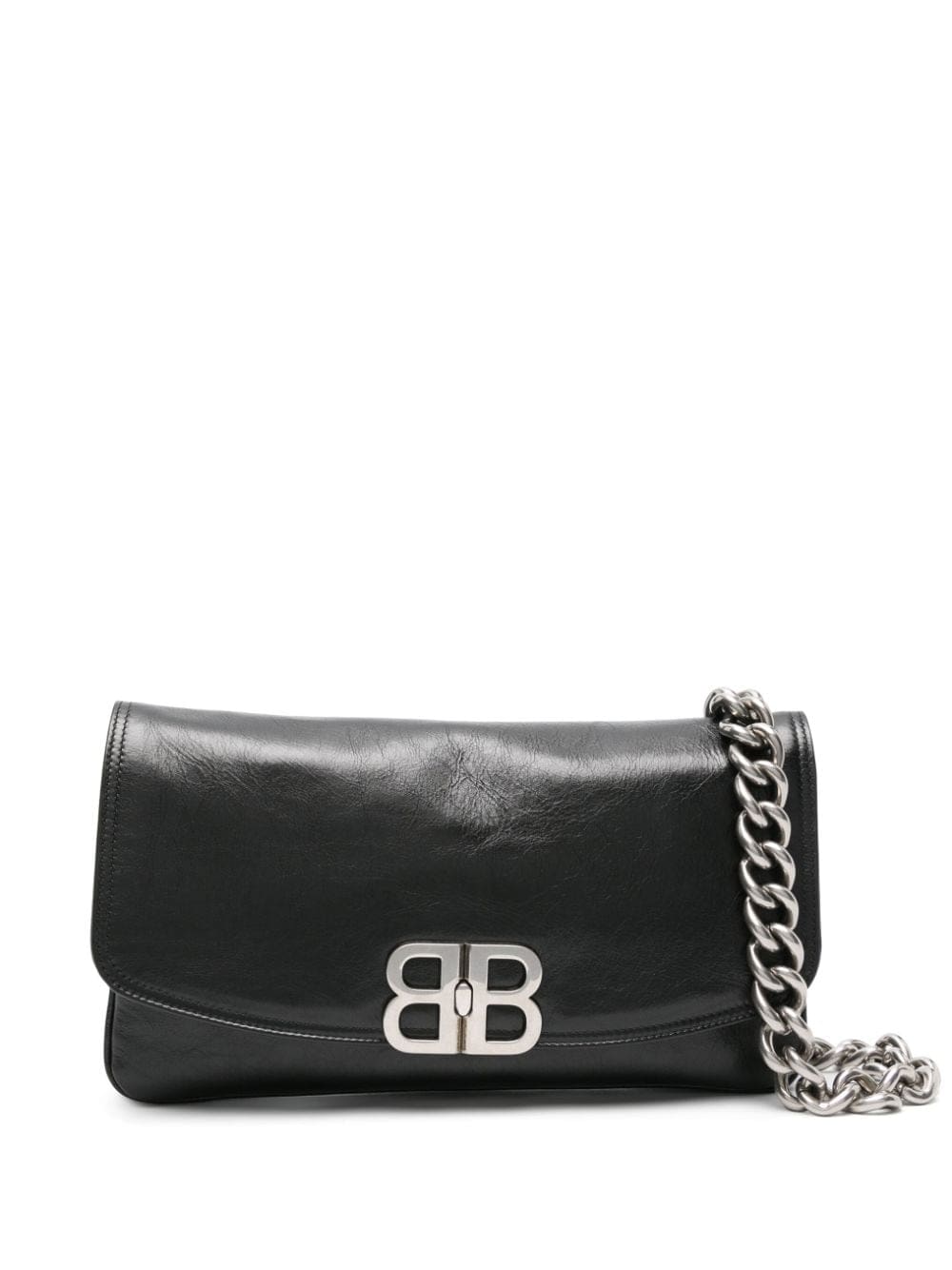 Balenciaga's BB Soft Flap bag blends softness and hardness. Crafted from smooth BLACK leather, it boasts a foldover top, twist lock fastening and a chain-link shoulder strap. Meanwhile, the metal silver-tone hardware and logo detailing juxtaposes against the supple, malleable material.