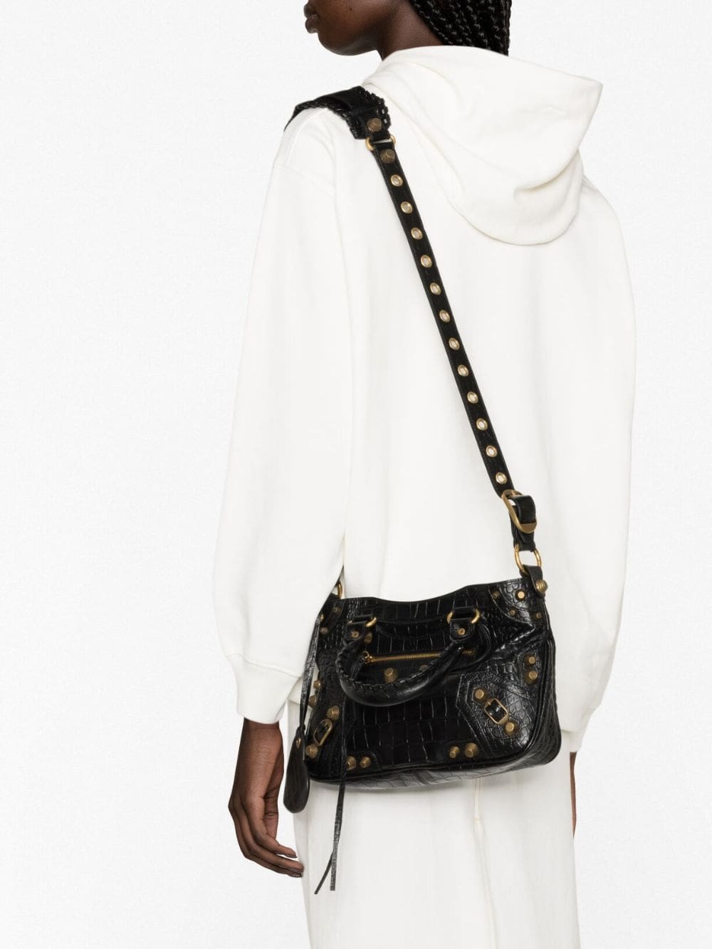 Taking its name from the French stereotype describing a cool and confident girl from Marseille, Balenciaga's Le Cagole bag adopts the maximalist aesthetic of the character in its bold design. This small iteration is accented with studs and eyelets and comes with a heart-shaped mirror and adjustable shoulder strap.