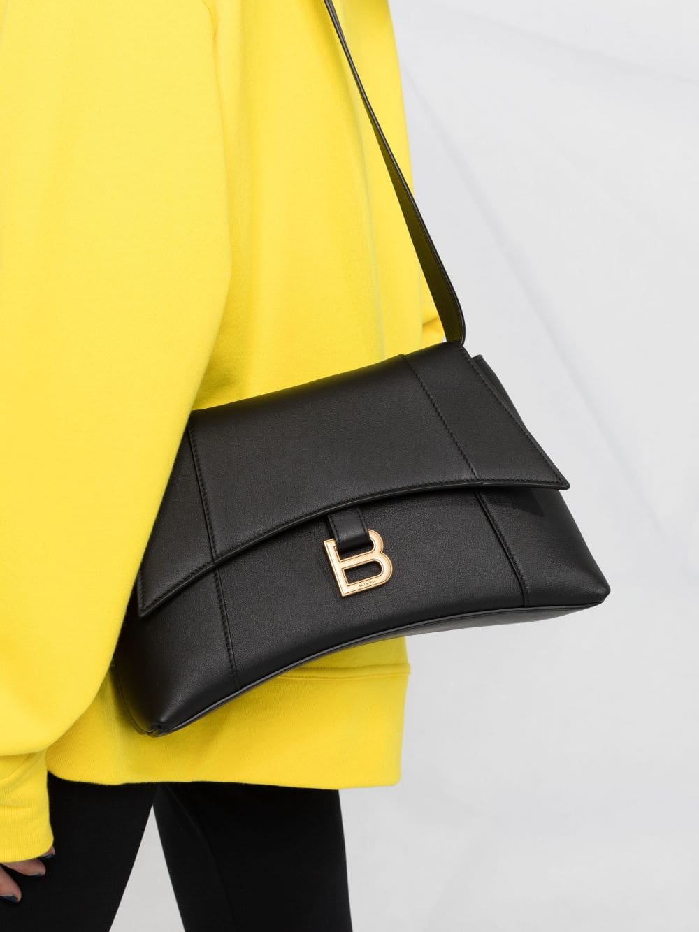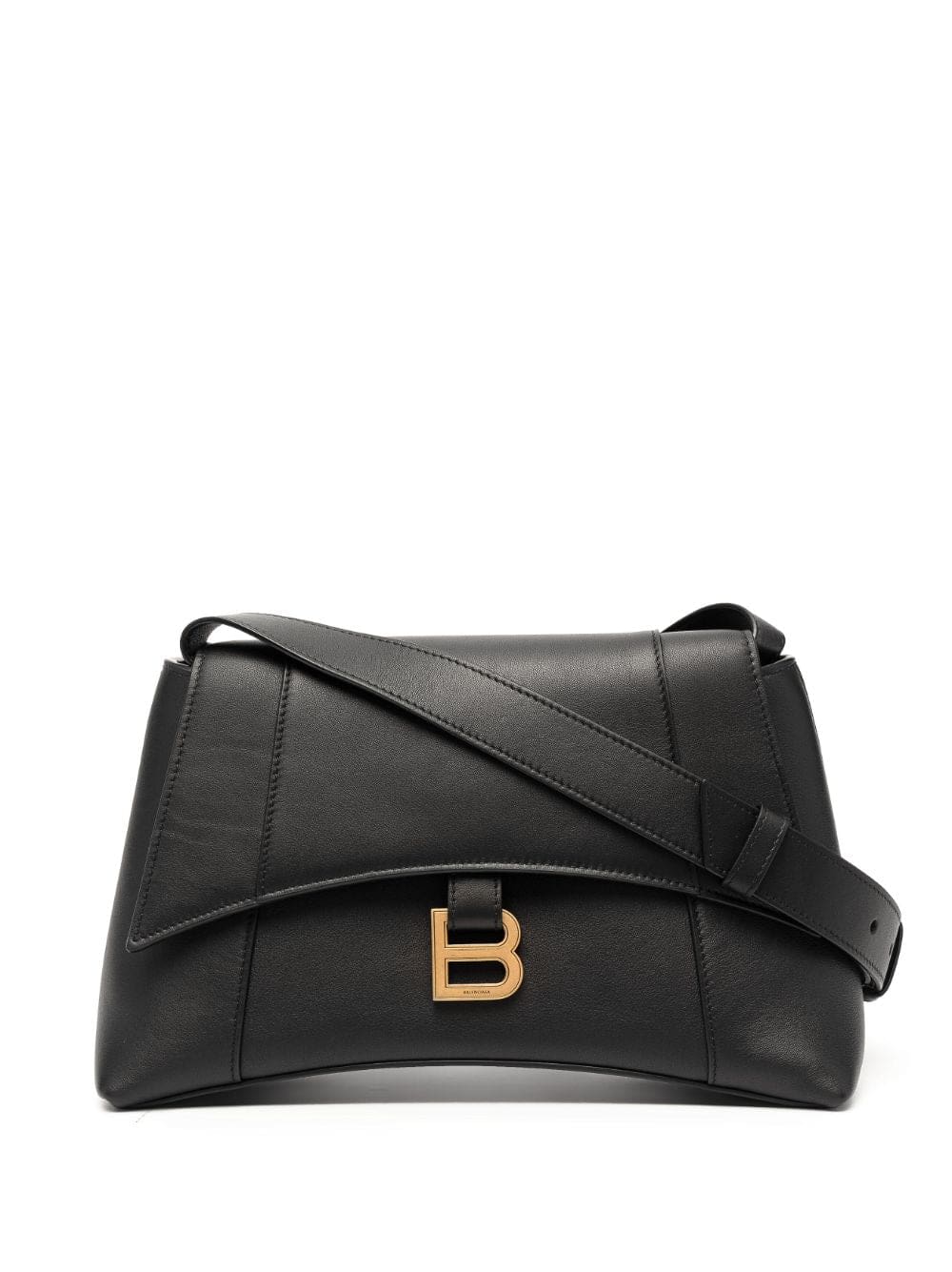 Balenciaga's Soft Hourglass shoulder bag emulates the shape of an hourglass with its curved silhouette. Crafted from black leather, it embraces the label's focus on discreet branding with a B plaque to the front.