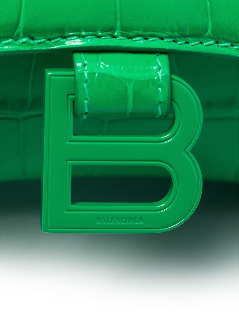 An embossed take on an iconic design, this Hourglass bag is presented here in a mini-sized iteration. Constructed from vivid green leather, this version opens up to a compact interior that fits small belongings distinctively.