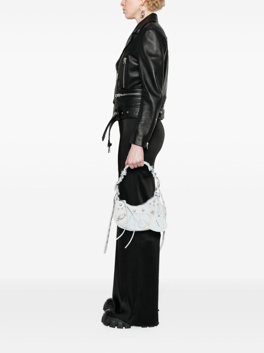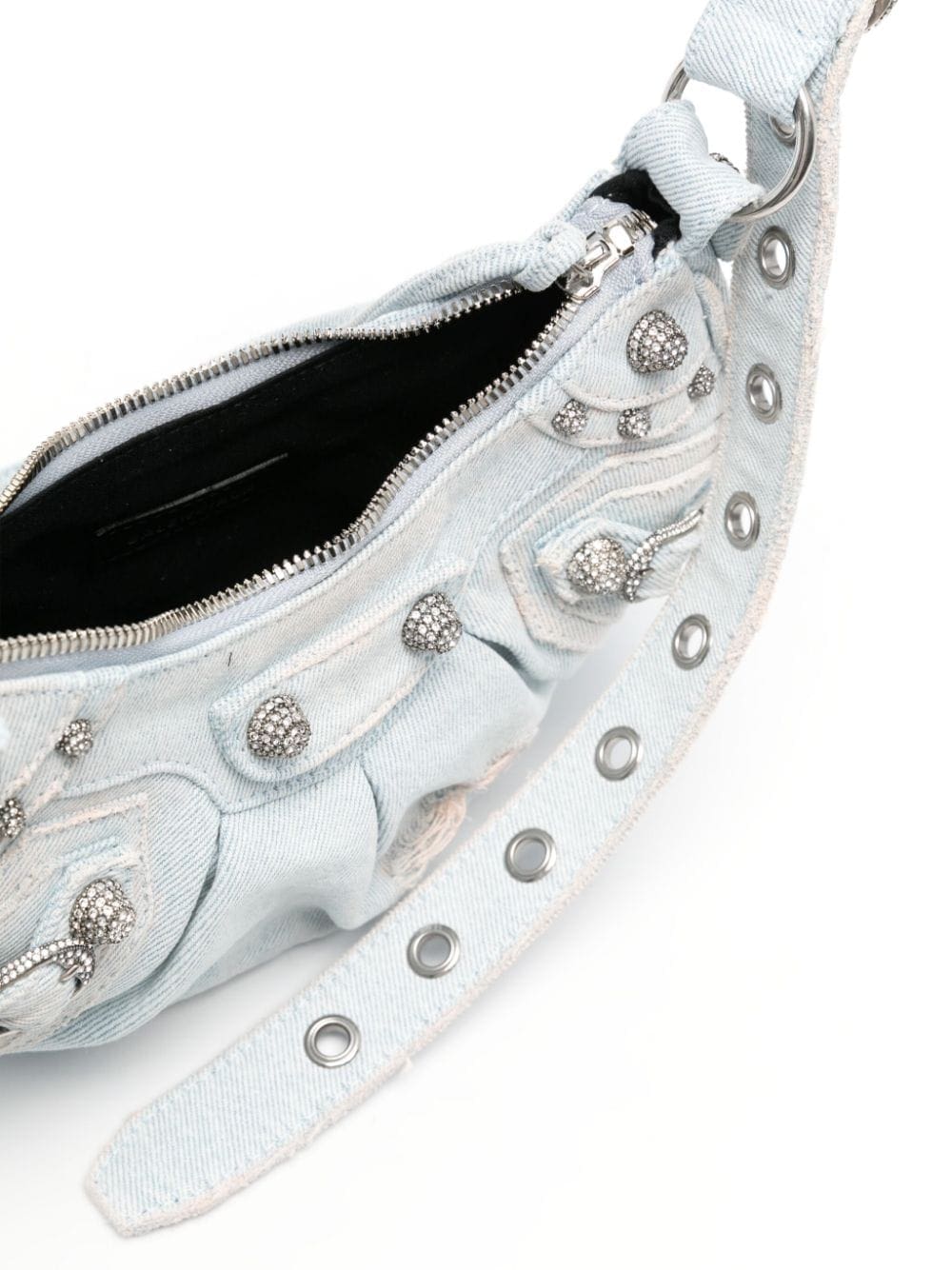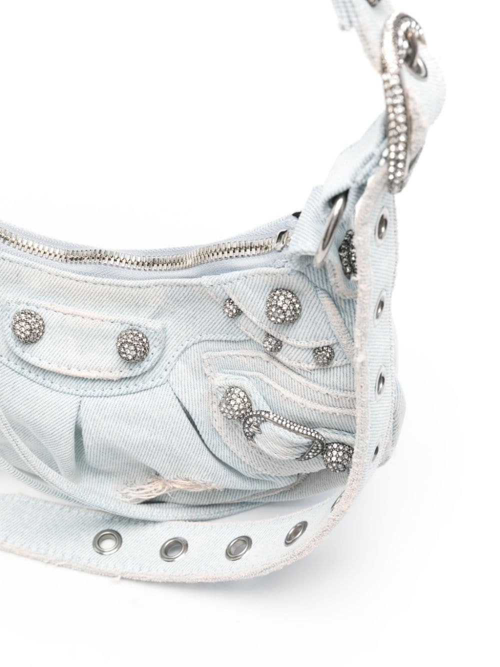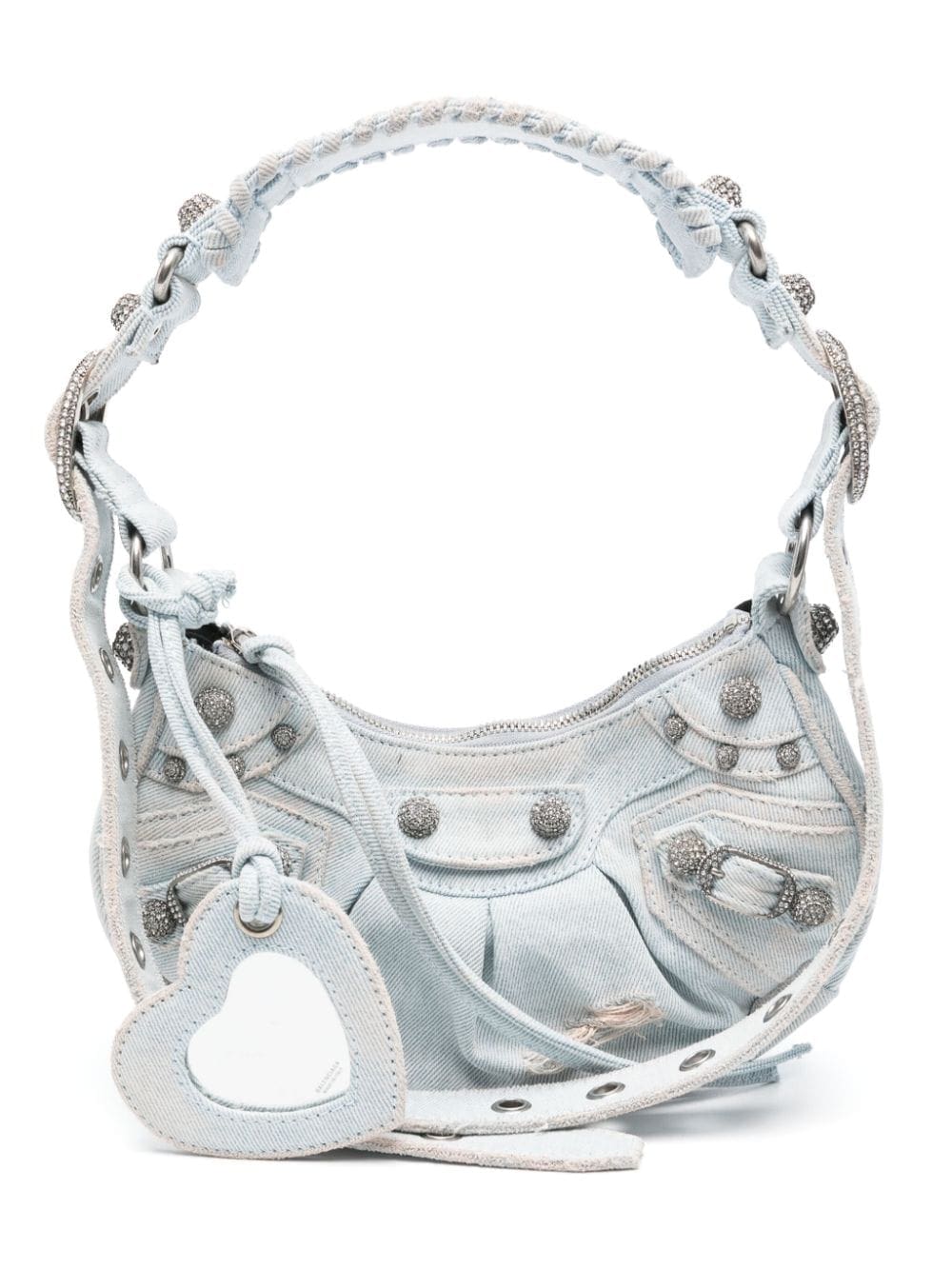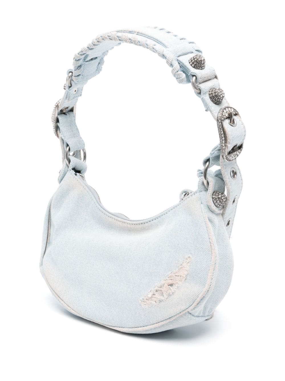 Balenciaga looks to the turn of the millennium for their noughties-inspired Le Cagole XS shoulder bag. Produced from light blue denim, it is constructed in a crescent shape and punctuated with metal studs and ripped detailing, whilst a detachable heart-shaped mirror and pouch add playfulness to its bold design.
