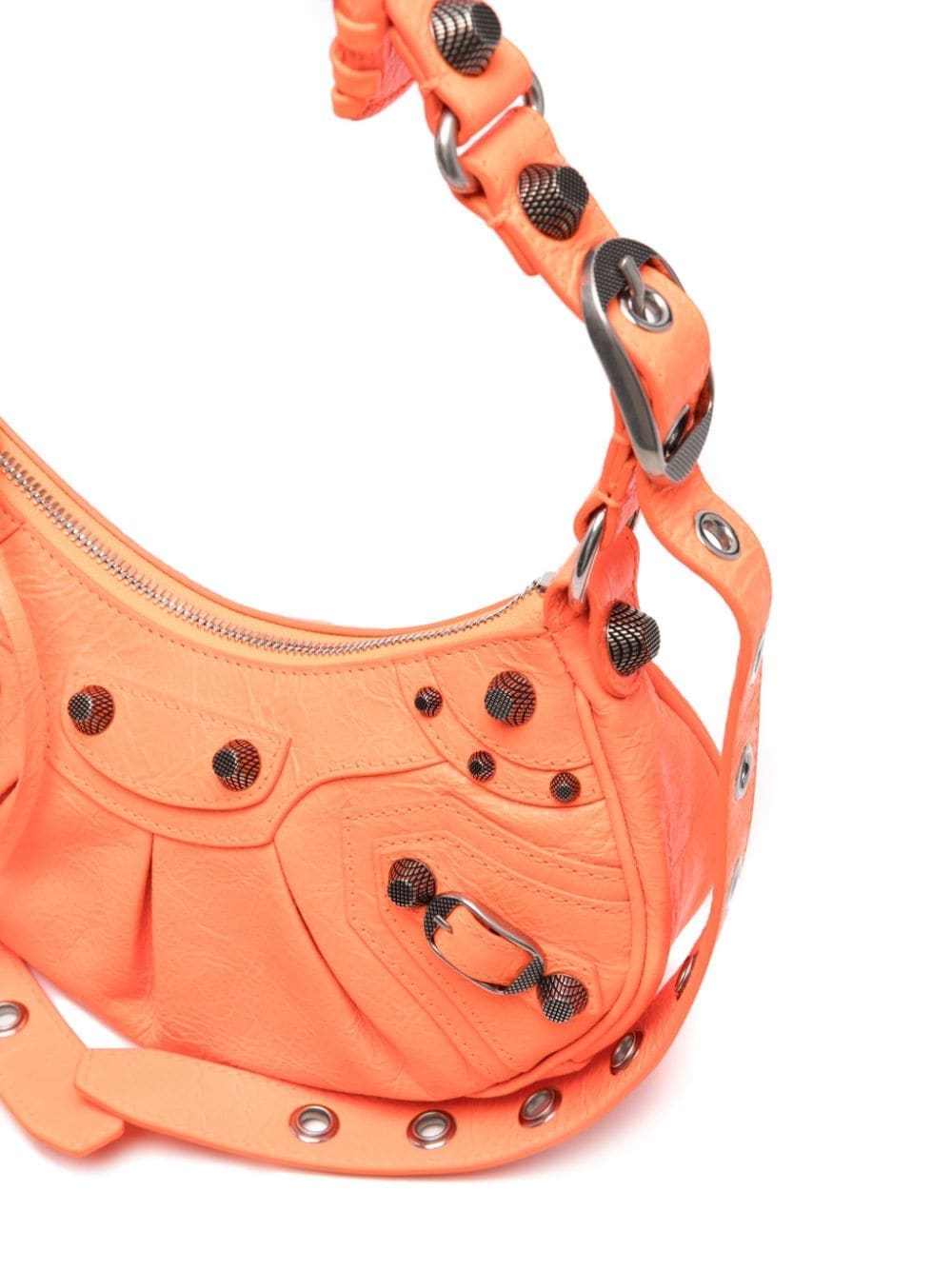 Balenciaga looks to the turn of the millennium for their noughties-inspired Le Cagole shoulder bag. Produced in a cracked shiny fluorescent orange hue, it is constructed in a hemispherical shape and punctuated with metal studs, whilst a detachable heart-shaped mirror and pouch charm add playfulness to its bold design.