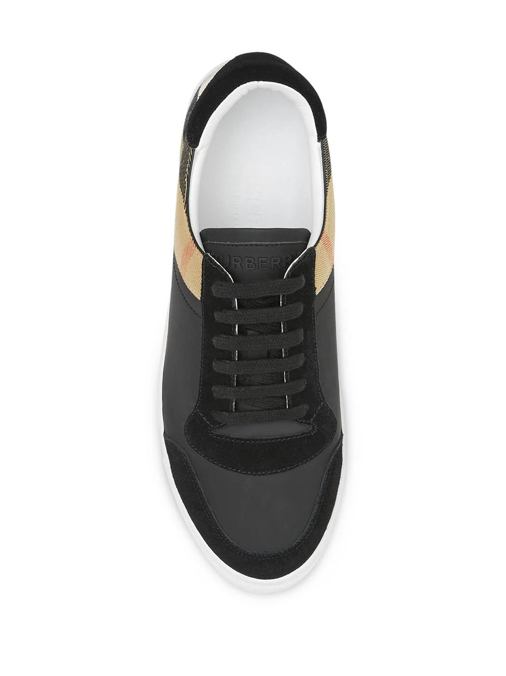 Take Burberry's House check with you wherever you go. These black leather low-top sneakers are panelled with check-embellished cotton in the signature archive beige palette. Sitting atop a white rubber sole, they're both sporty and refined all at once. Featuring a round toe, a lace-up front fastening, a white rubber sole and House check panels.