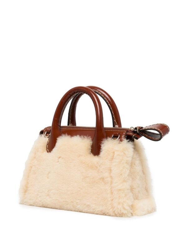 sepia brown leather shearling trim logo tag two rounded top handles detachable shoulder strap top zip fastening main compartment internal zip-fastening pocket front buckle-fastening pocket