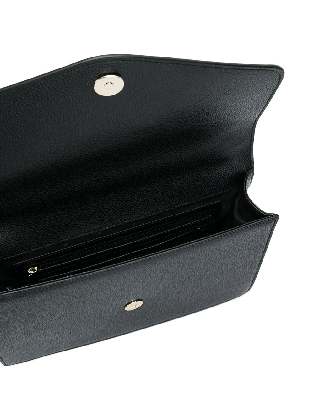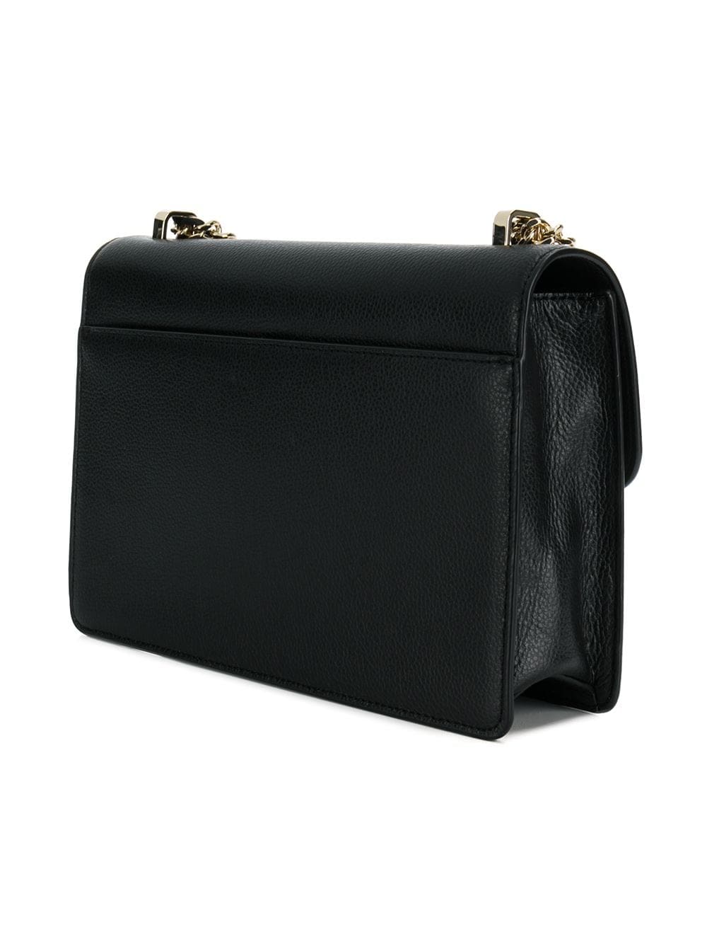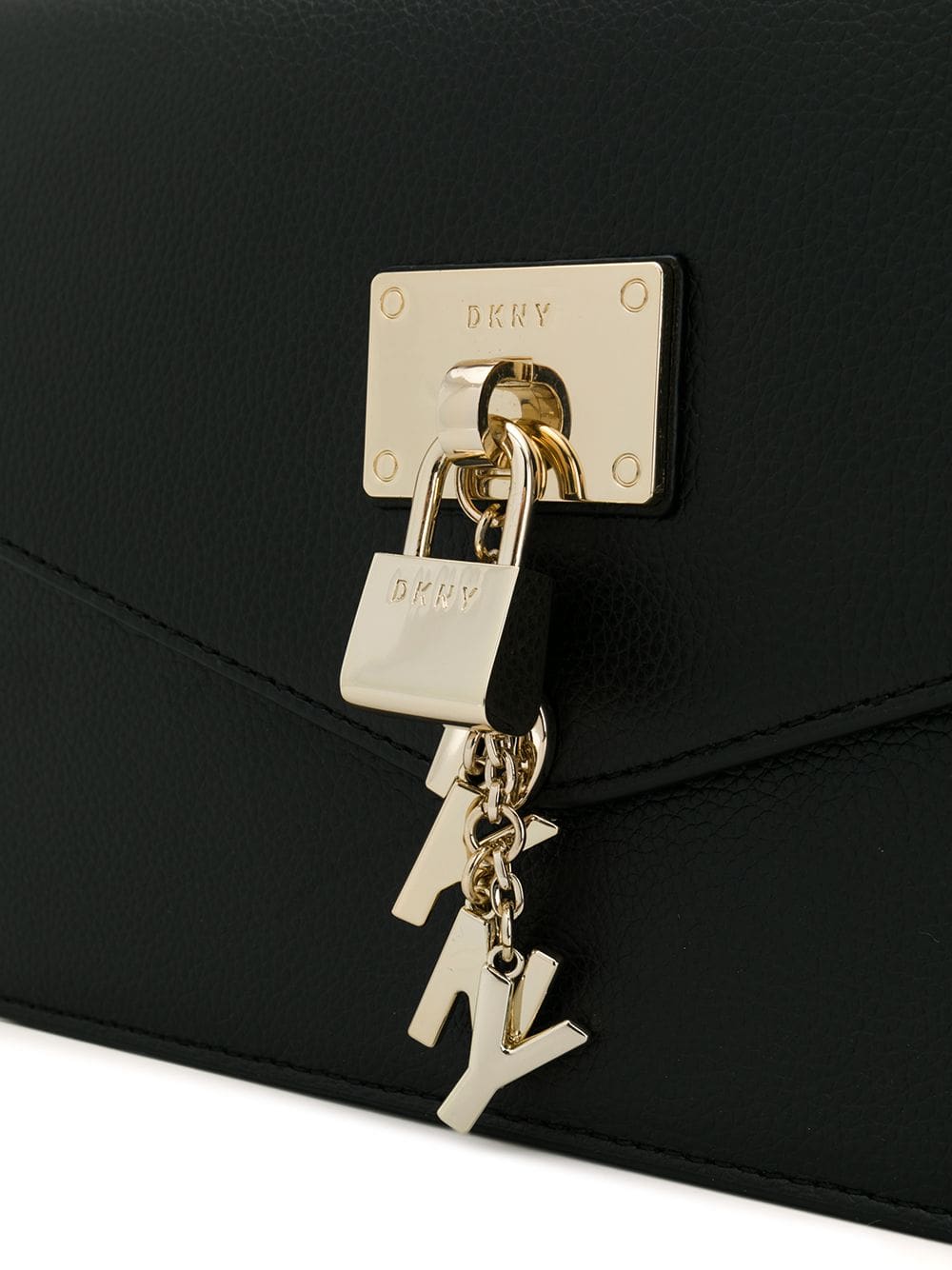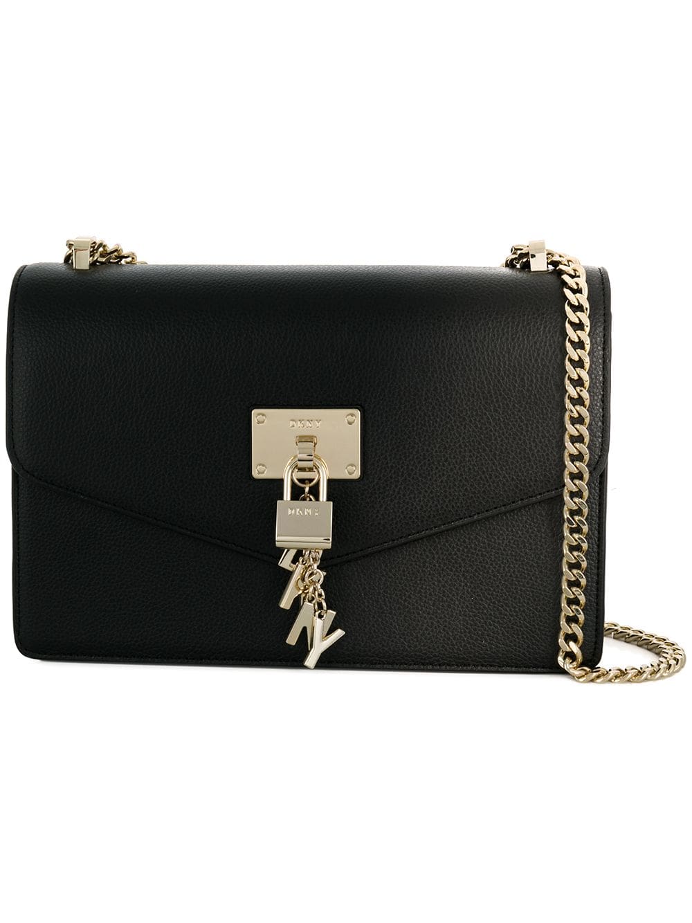 This black leather large Elissa shoulder bag from DKNY features a foldover top with magnetic closure, hanging padlock detail, gold-tone hardware, a gold-tone chain shoulder strap and an internal zipped pocket.