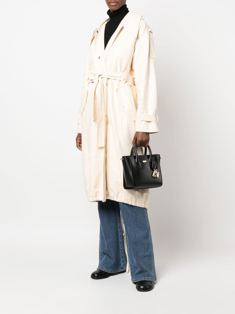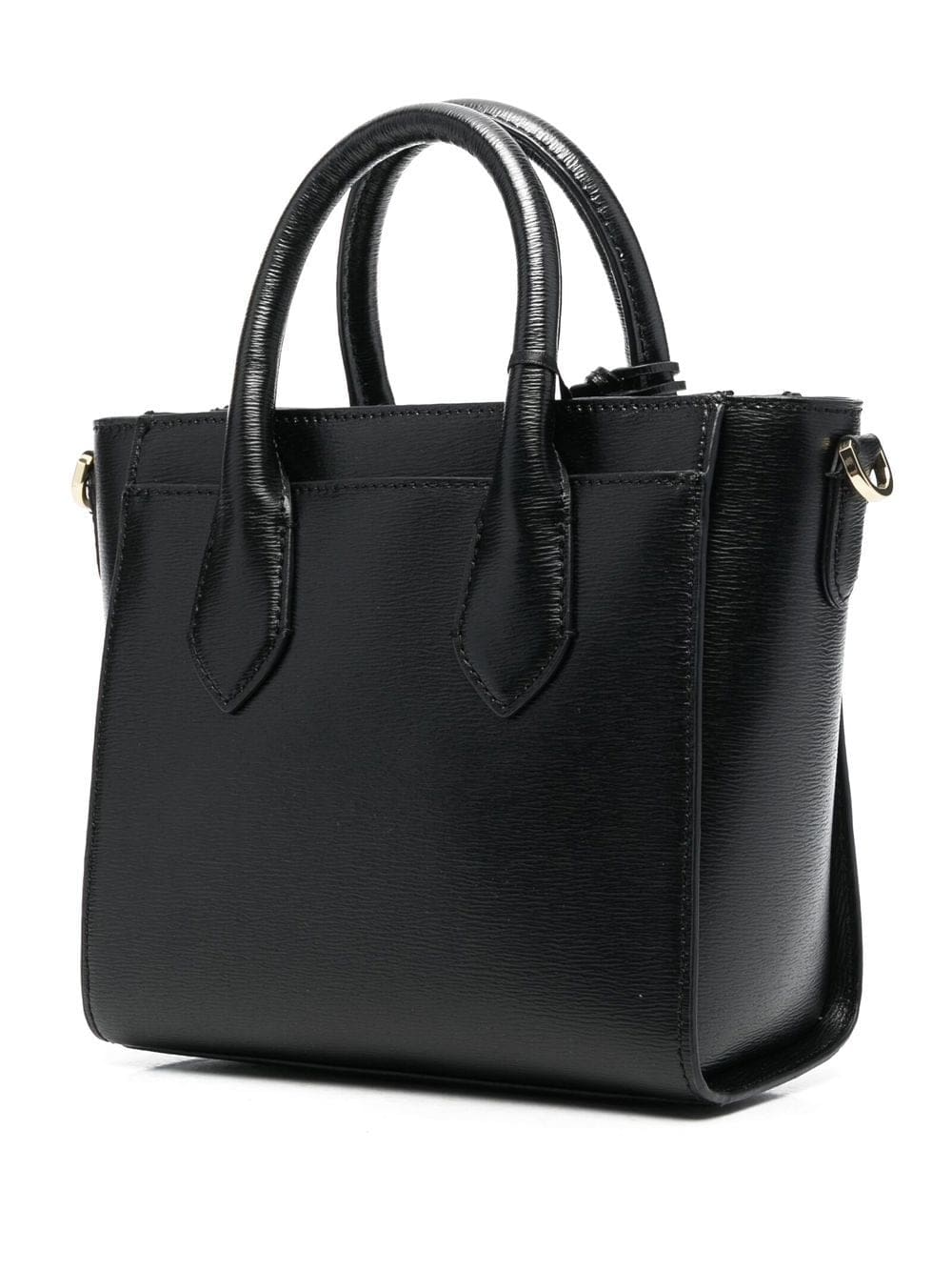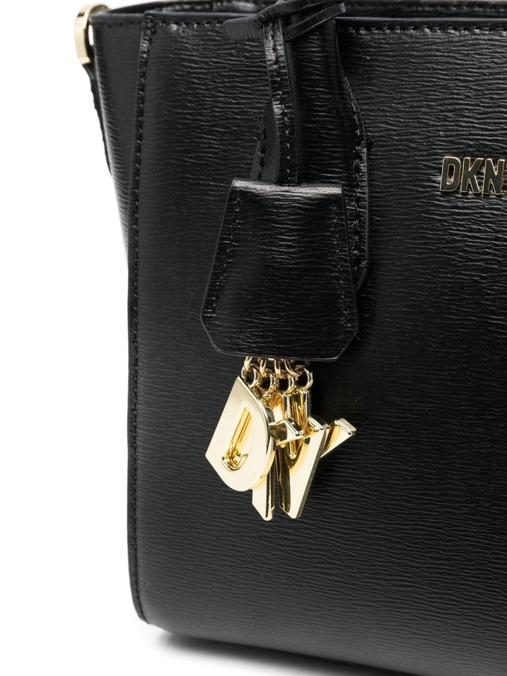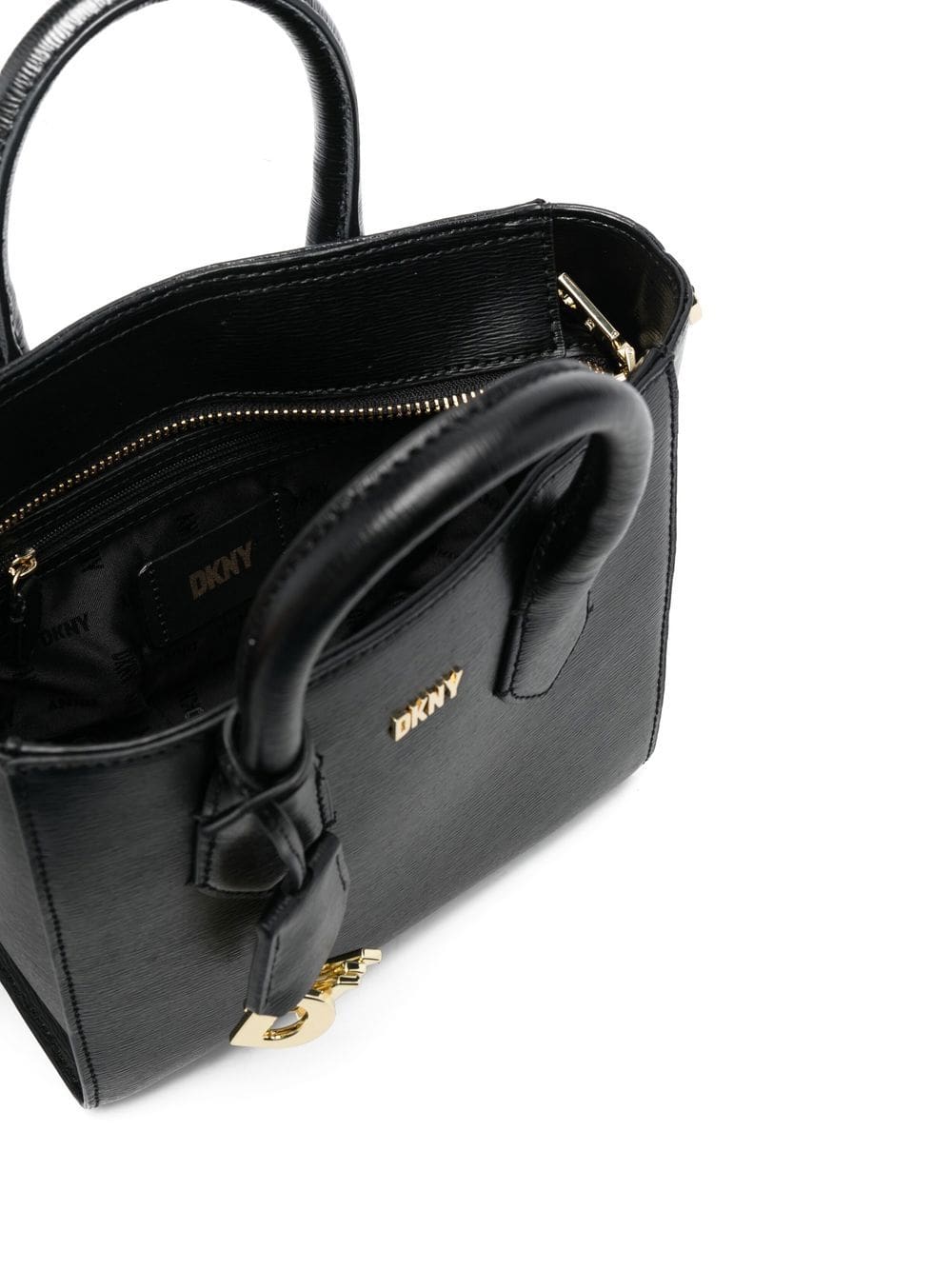 logo-plaque tote bag from DKNY featuring jet black, gold-tone logo plaque, two top handles, single shoulder strap and main compartment.