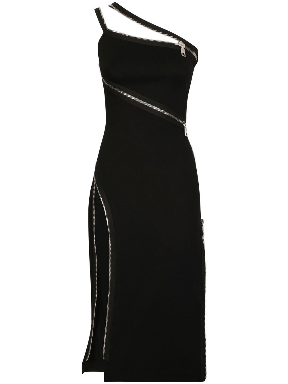 black one-shoulder cut-out detailing zip details stretch-design below-knee length straight hem