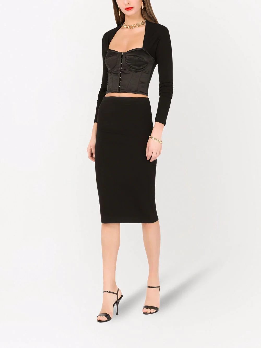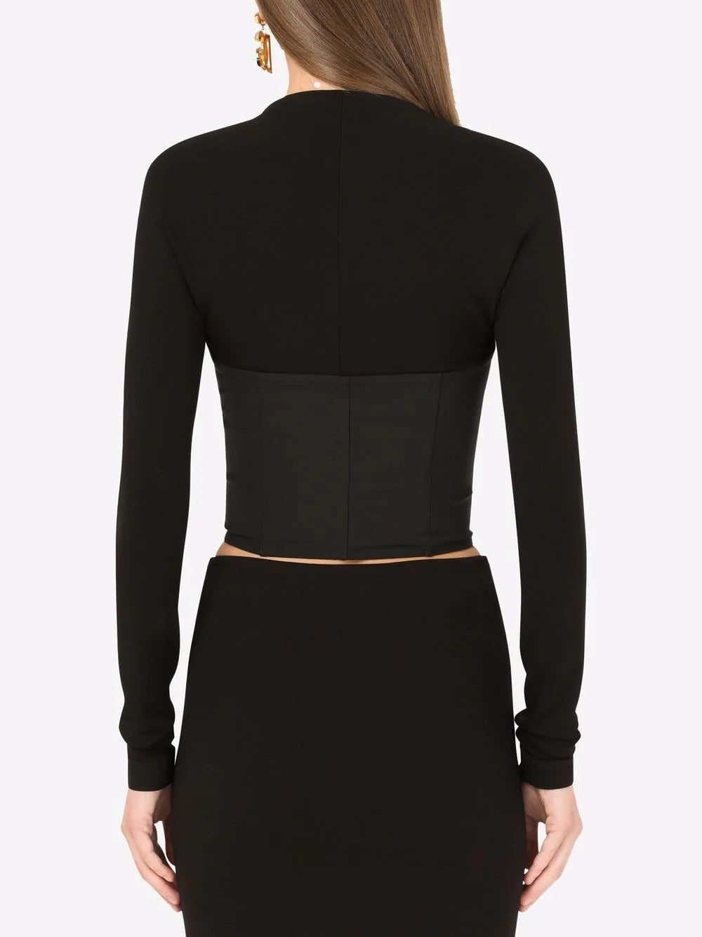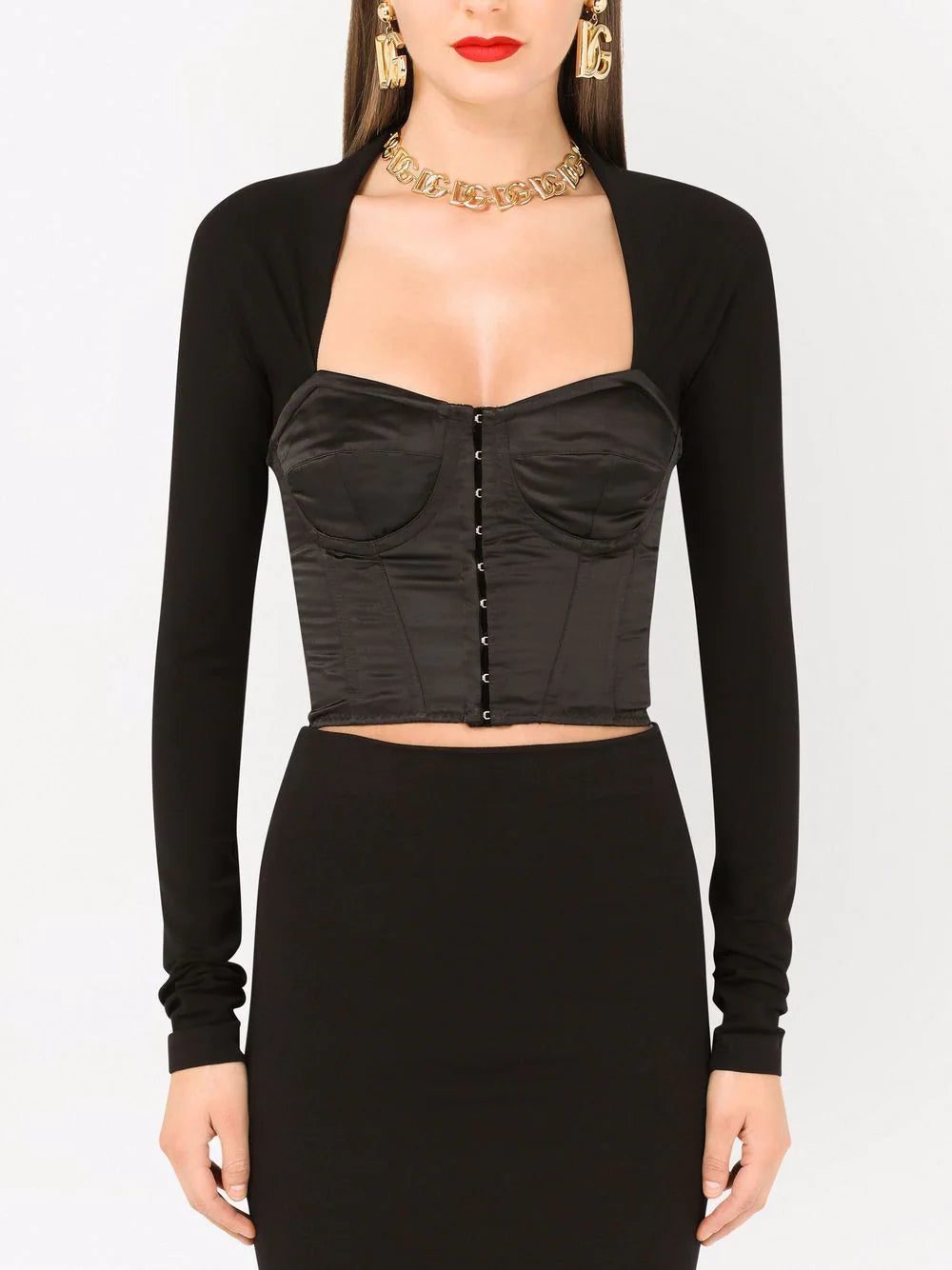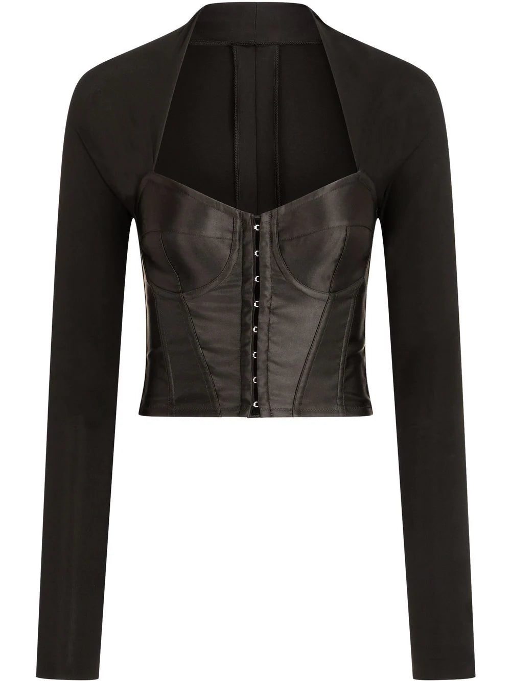 Black bodice-effect long-sleeved top from DOLCE & GABBANA featuring stretch-design, panelled bodice, piped-trim detailing, hook and eye fastening, sweetheart neck and long sleeves.