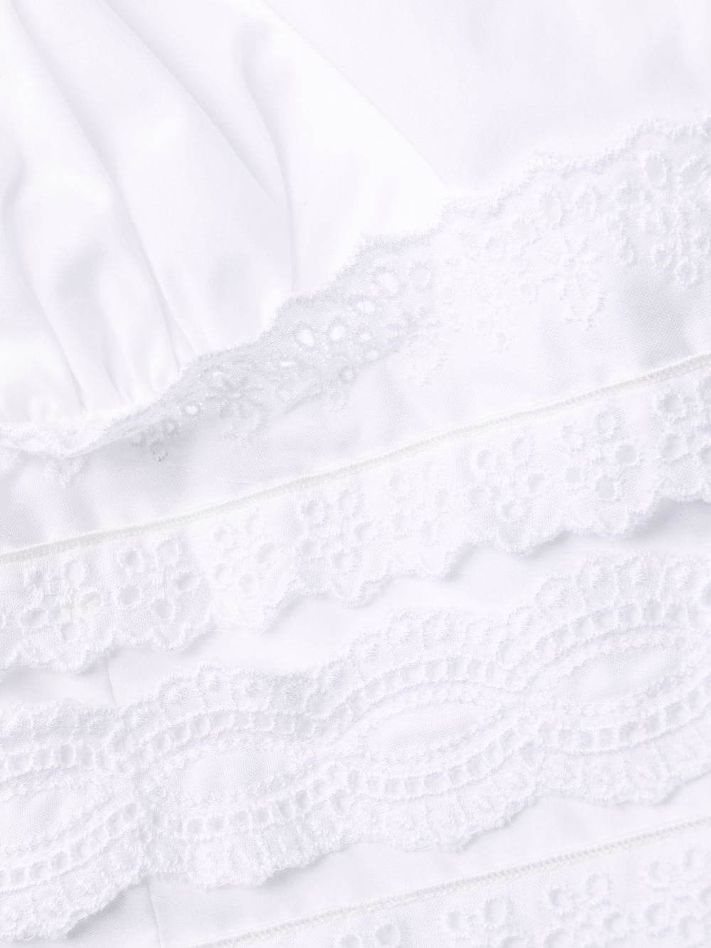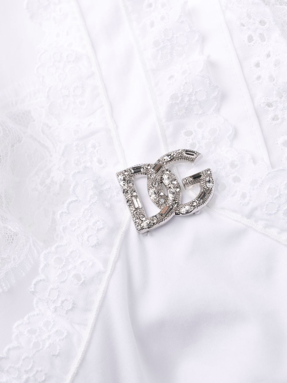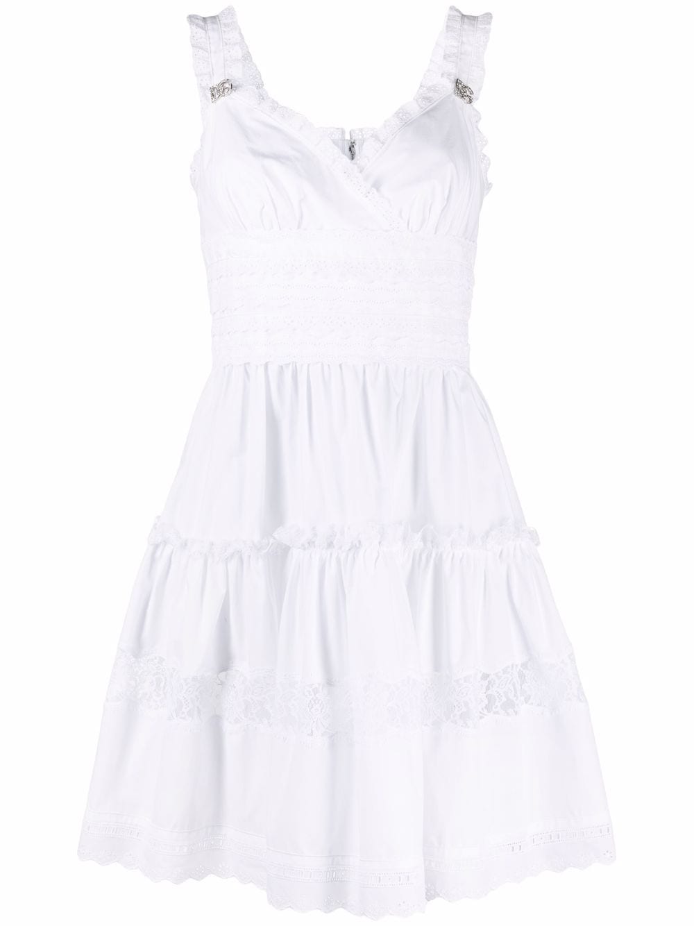 White is the predominant colour in Dolce & Gabbana's SS22 collection, one that celebrates classic Italian silhouettes and traditional craftsmanship. Cut from cotton, this tiered dress is delicately accented with lace and Broderie Anglaise inserts for a romantic finish, complemented by the crystal-embellished D&G logo plaques on the straps.