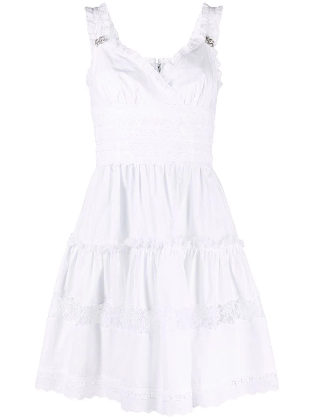 White is the predominant colour in Dolce & Gabbana's SS22 collection, one that celebrates classic Italian silhouettes and traditional craftsmanship. Cut from cotton, this tiered dress is delicately accented with lace and Broderie Anglaise inserts for a romantic finish, complemented by the crystal-embellished D&G logo plaques on the straps.
