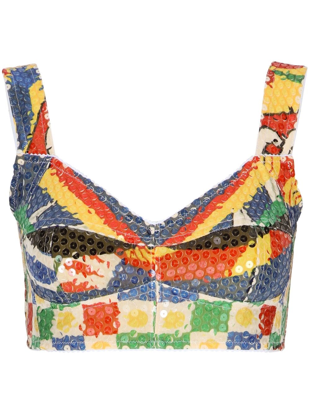 Decorated with the Carretto print – a pattern from the Dolce & Gabbana archives – this crop top is covered in multicolour shapes and graphics. It's cut to a cropped silhouette and covered in shimmering sequins.