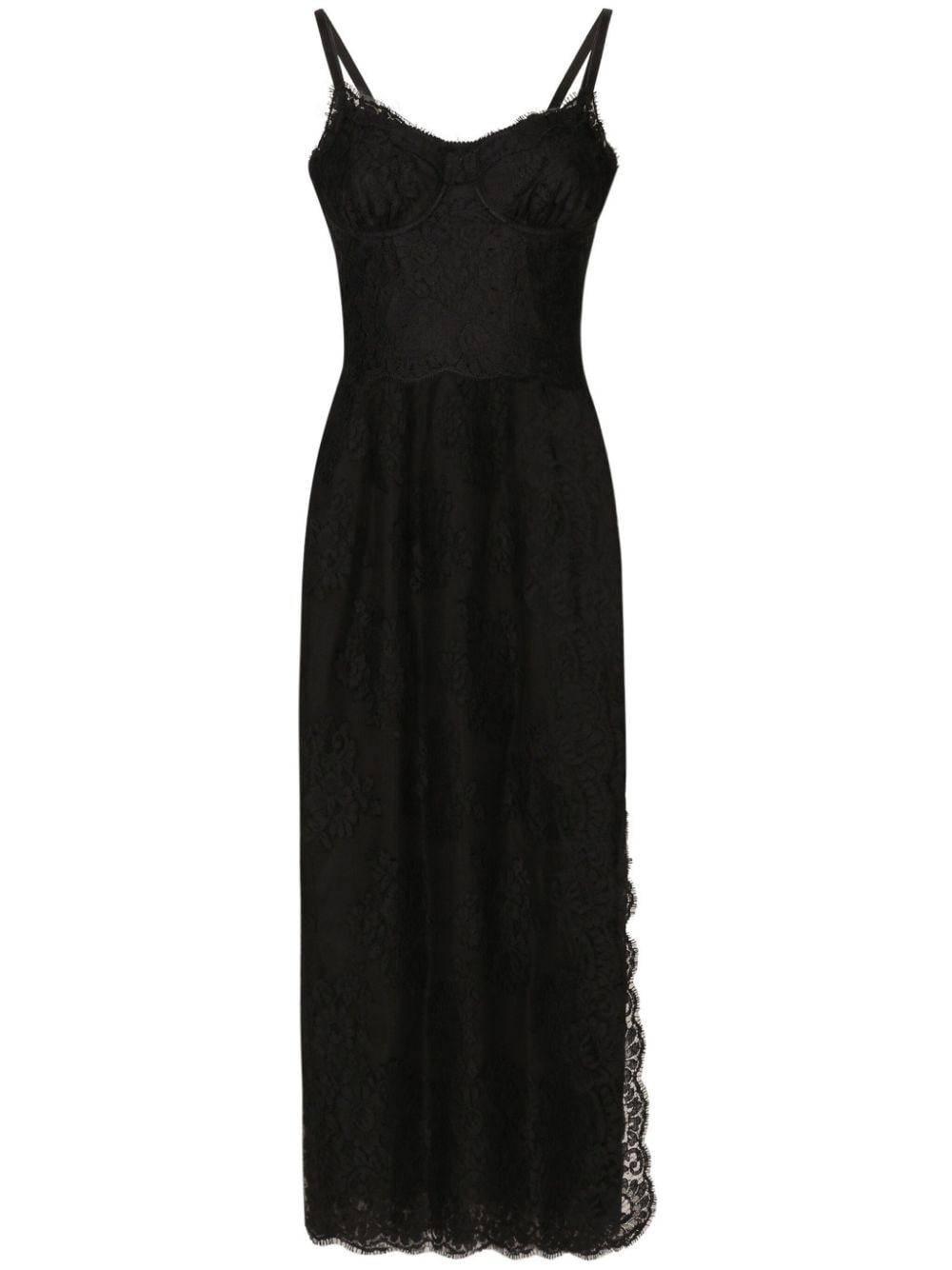 Dolce & Gabbana draws inspiration from 'the imagery of old Sicily' in its SS24 collection. A prime example, this black dress is made from delicate Chantilly lace to a slip silhouette with lingerie-inspired spaghetti straps and underwire cups.