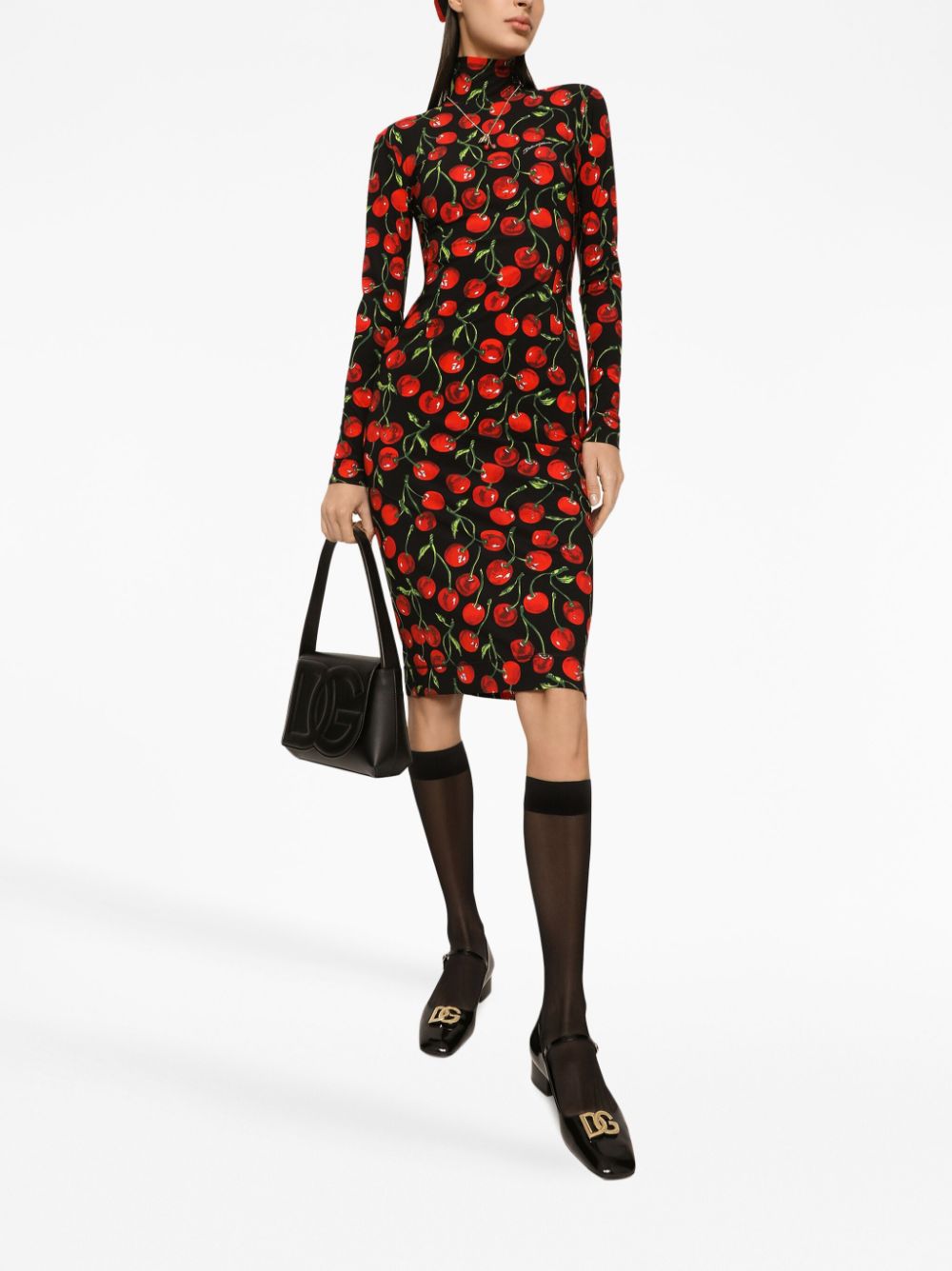 The multicolour cherry print defines this dress from DOLCE & GABBANA's AW23 collection. The slim-fitting silhouette features a high neck and long sleeves.