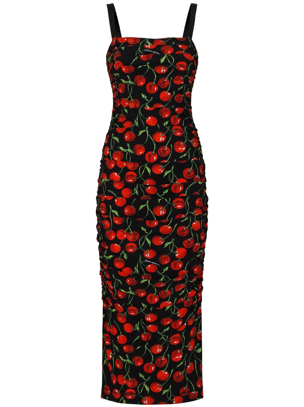 With a flair for eye-striking prints, Dolce & Gabbana presents this midi dress, which is covered in a vibrant cherry print. It's fitted with lingerie-style shoulder straps and features ruched detailing that lends the pattern a sense of movement.
