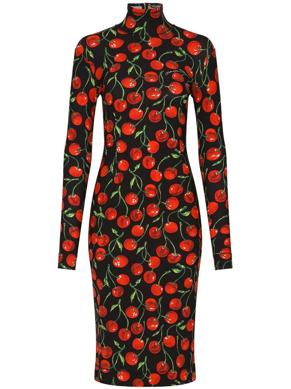 The multicolour cherry print defines this dress from DOLCE & GABBANA's AW23 collection. The slim-fitting silhouette features a high neck and long sleeves.