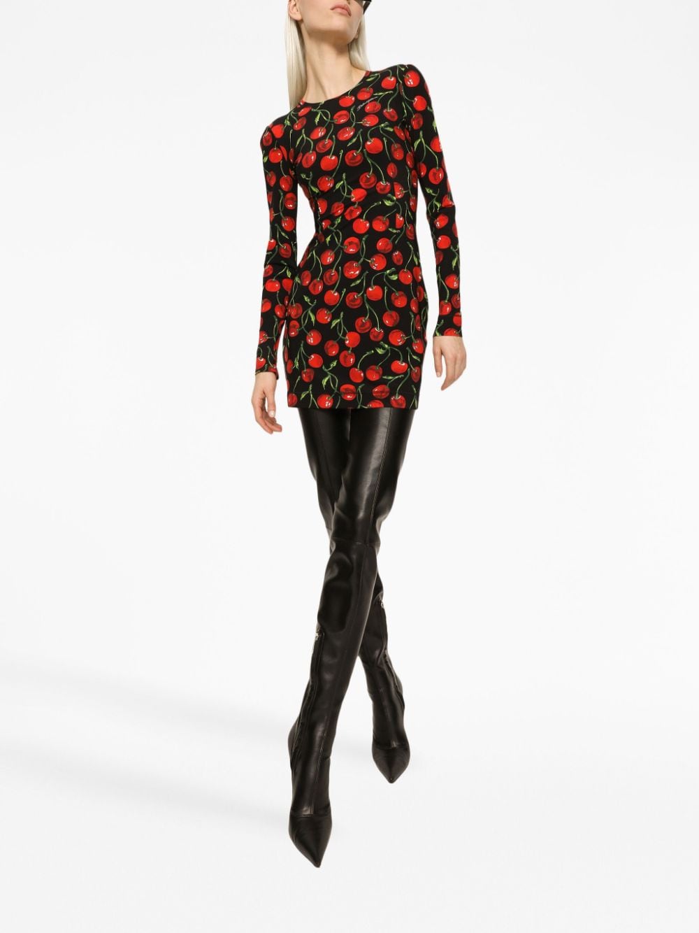 A striking cherry print distinguishes Dolce & Gabbana's AW23 collection, adorning dresses and skirts alike. The bright motif enlivens the minimal construction of this long-sleeved minidress.