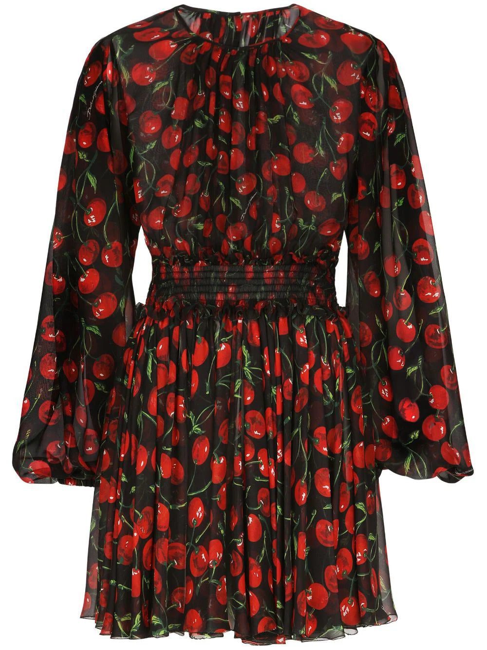 A striking cherry print distinguishes Dolce & Gabbana's AW23 collection, adorning dresses and skirts alike. Crafted from sumptuous silk, this minidress pairs the bright motif with a smocked waist and pleated skirt.