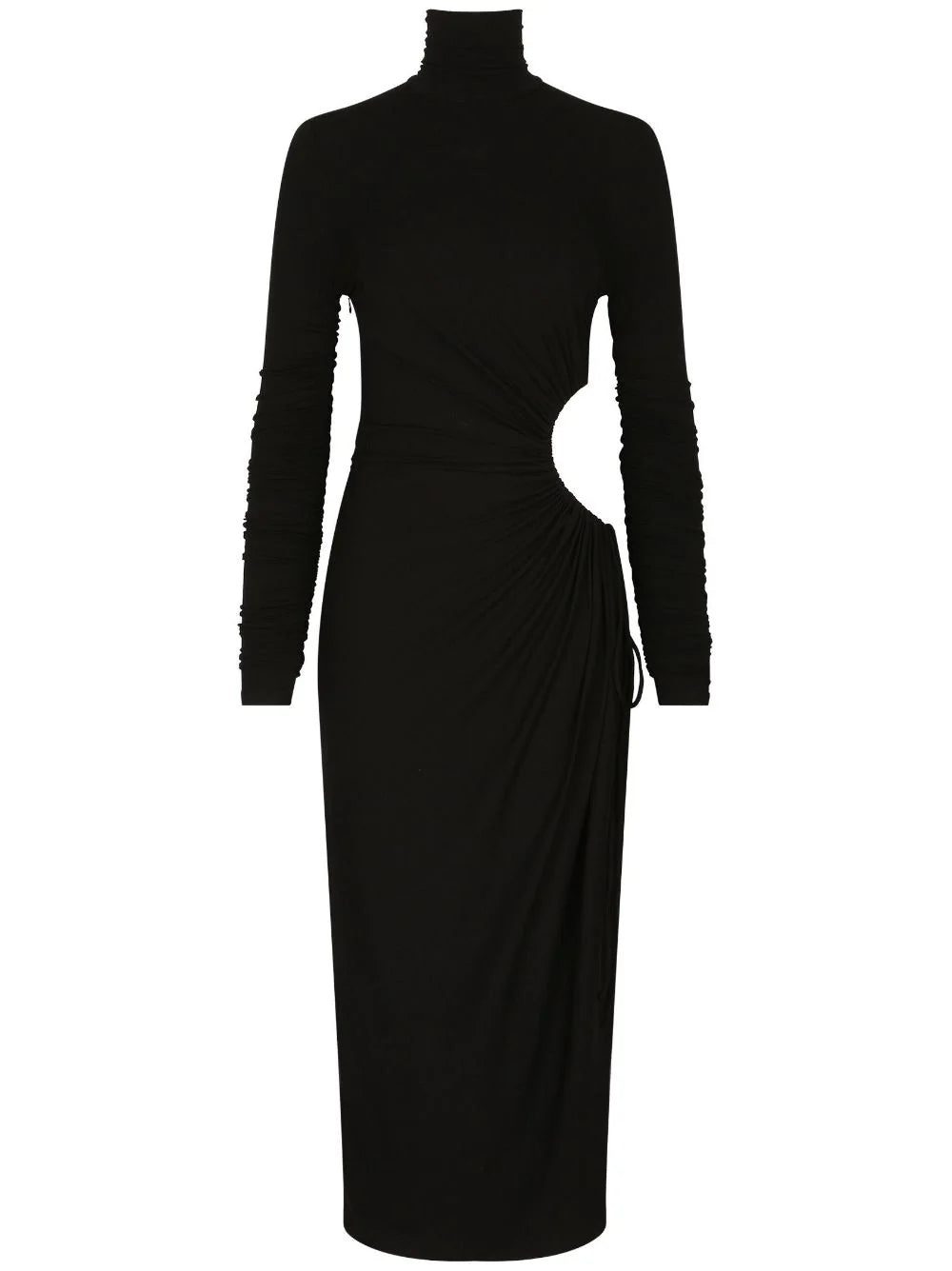 Dolce & Gabbana debuts this sleek, black dress for AW23. Featuring a high side slit and a cut-out at the hip, the striking design is finished with contrasting long sleeves and a high neck.