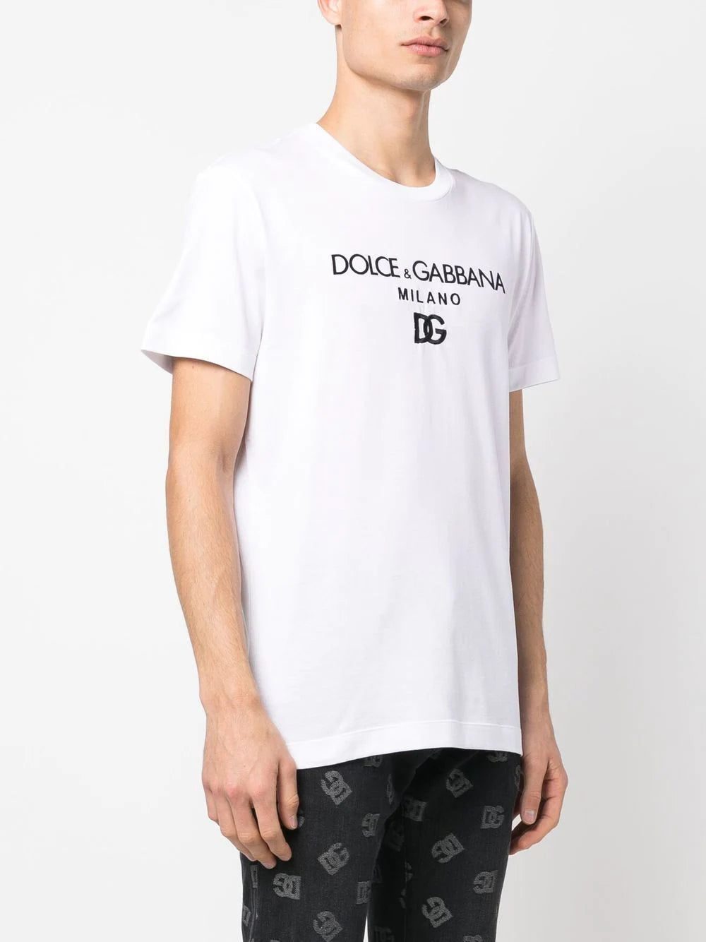 DG Essentials logo-embroidered T-shirt from DOLCE & GABBANA featuring white/black, cotton, jersey knit, embroidered logo to the front, crew neck, short sleeves and straight hem.