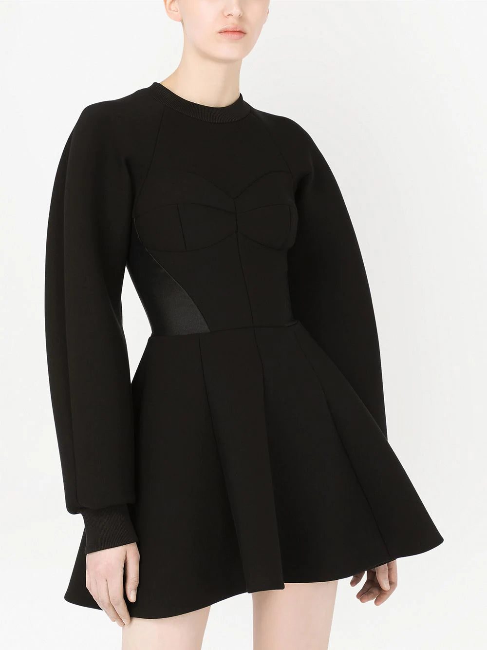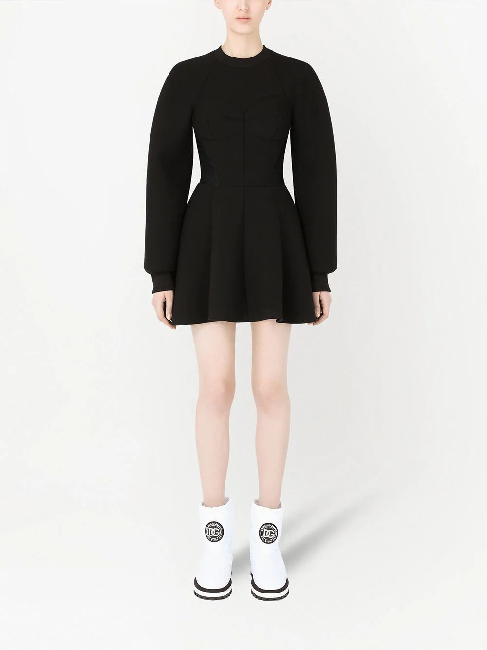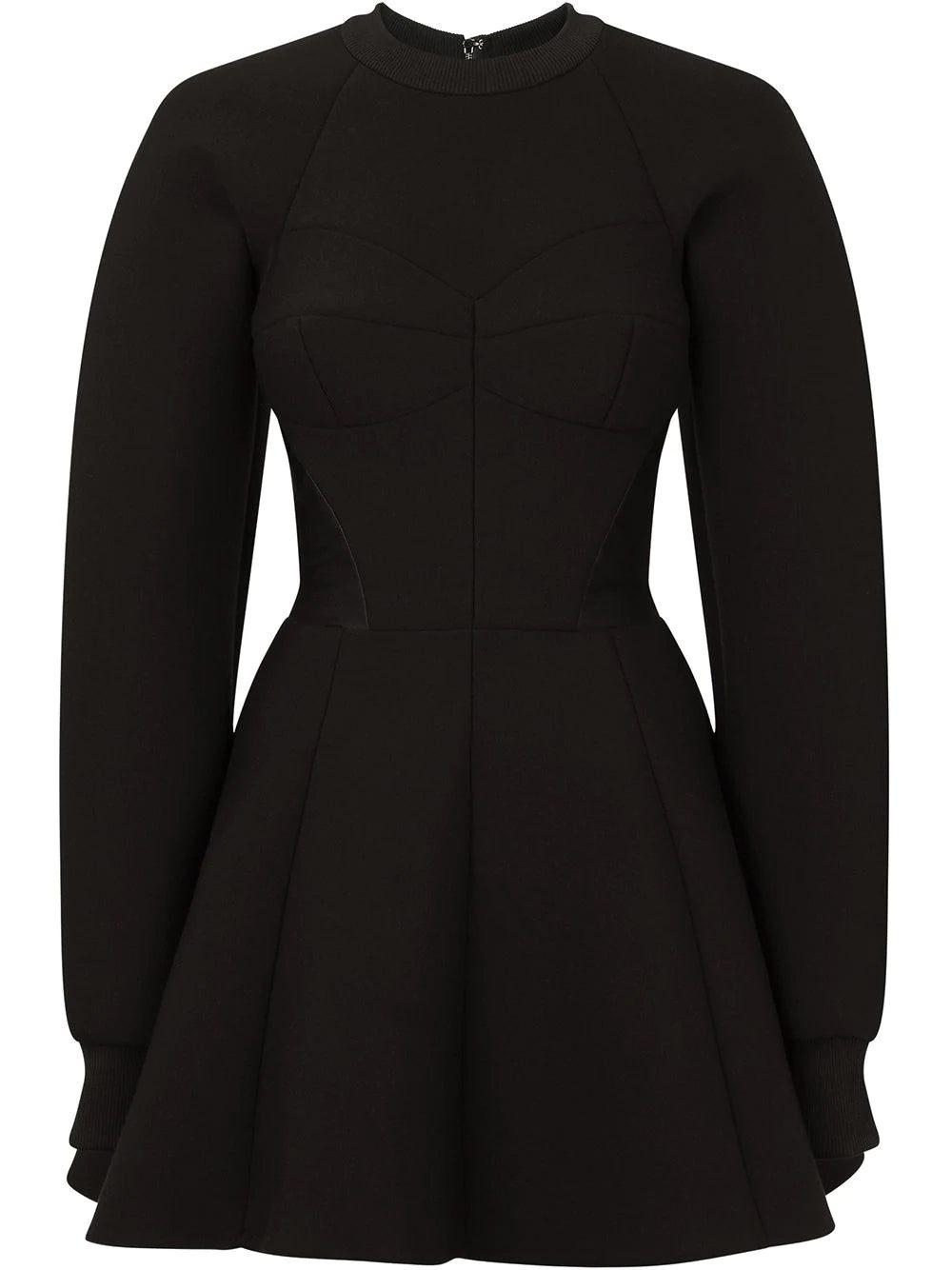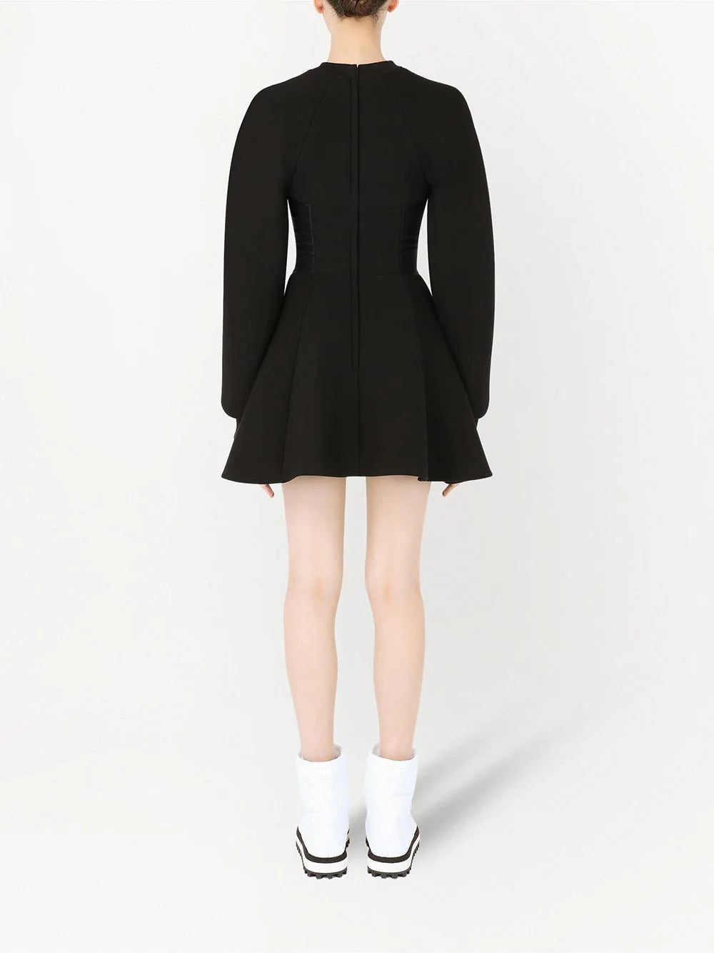 Black flared fitted-waistline dress from DOLCE & GABBANA featuring stretch-design, fitted waistline, piped-trim detailing, round neck, rear zip fastening, long raglan sleeves and flared skirt.