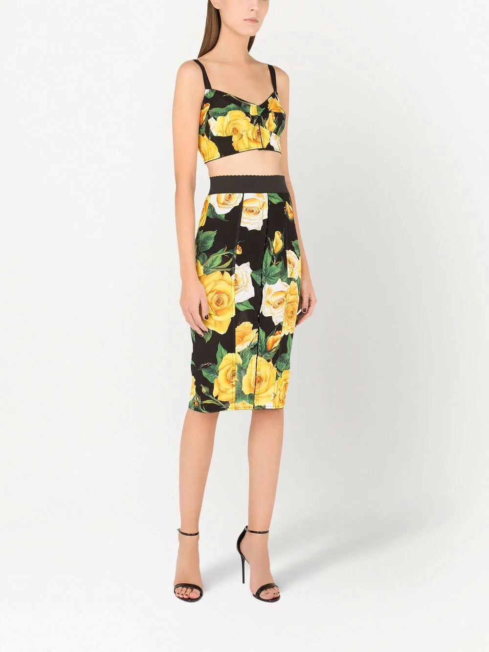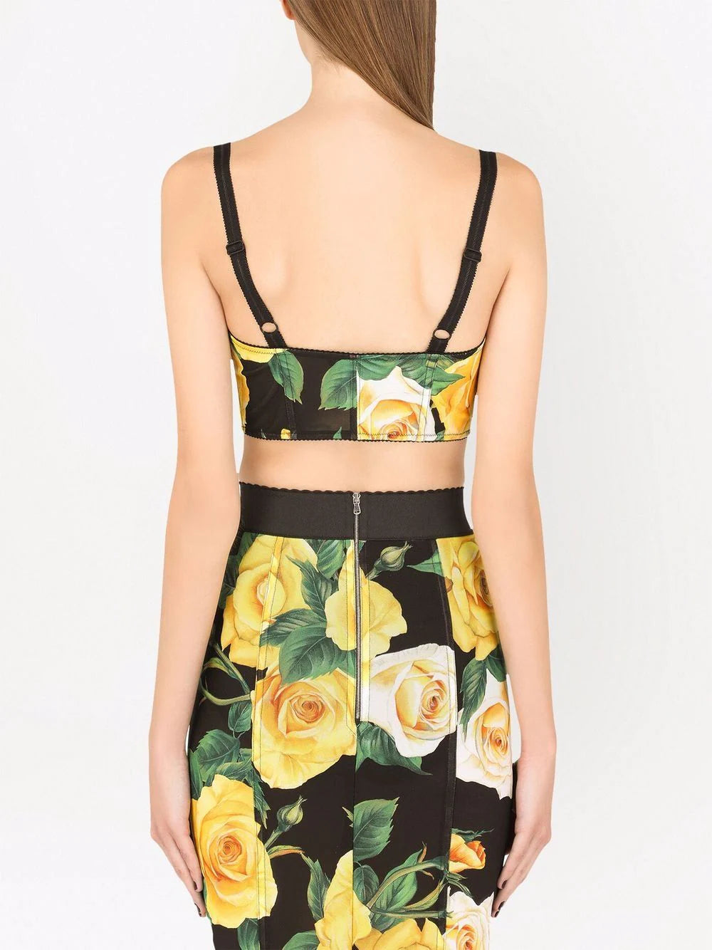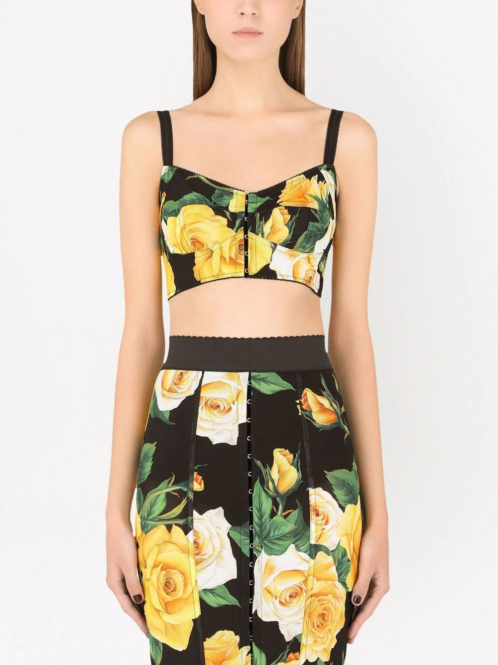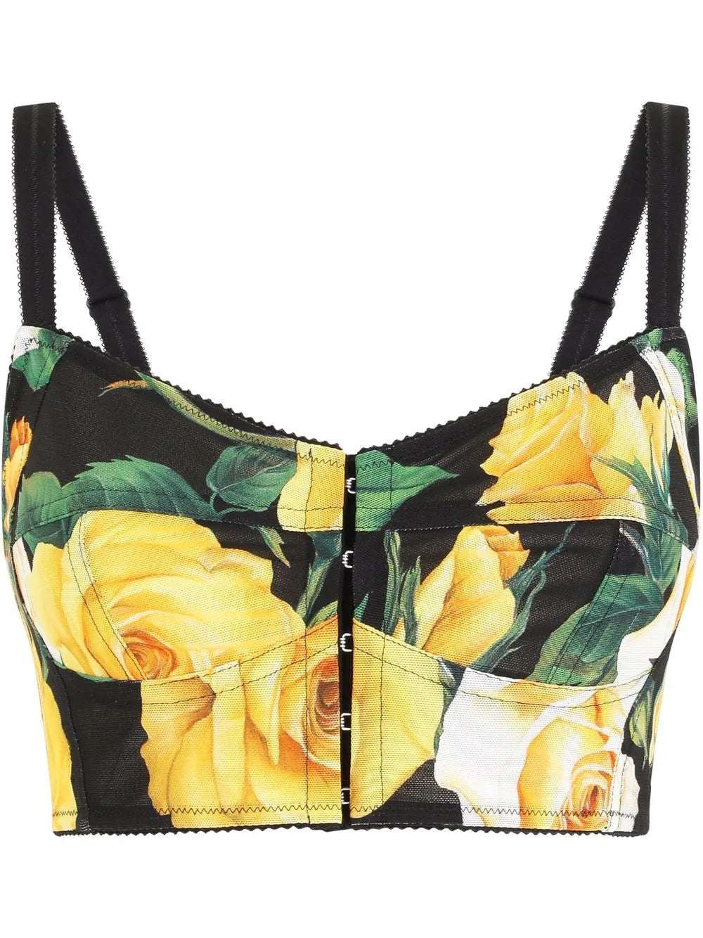 Black/yellow/green floral-print cropped bralette top from DOLCE & GABBANA featuring all-over floral print, underwire cup, adjustable shoulder straps, scallop edge, front hook and eye fastening and cropped.
