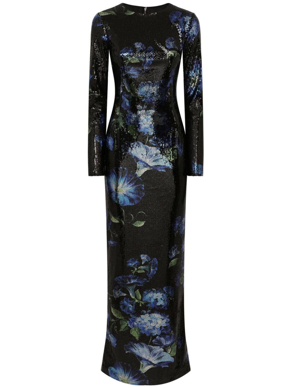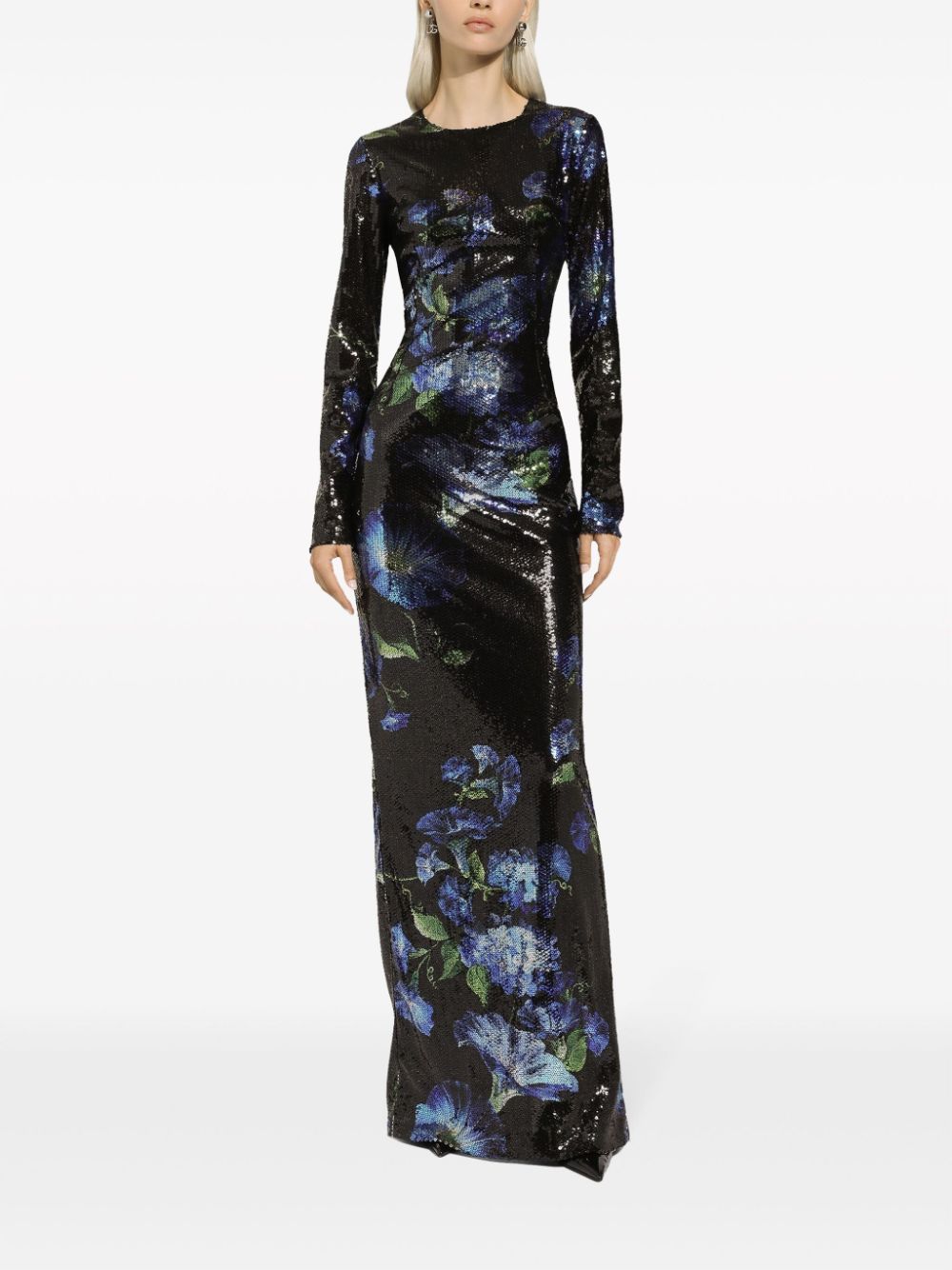 Floral motifs and shimmering embellishments imbue this Dolce & Gabbana gown with signature maximalist decadence. Crafted to a sleek column silhouette, it is covered in scores of sequins and stamped with a bellflower print, lending layers of depth and dimension to evoke a striking look.