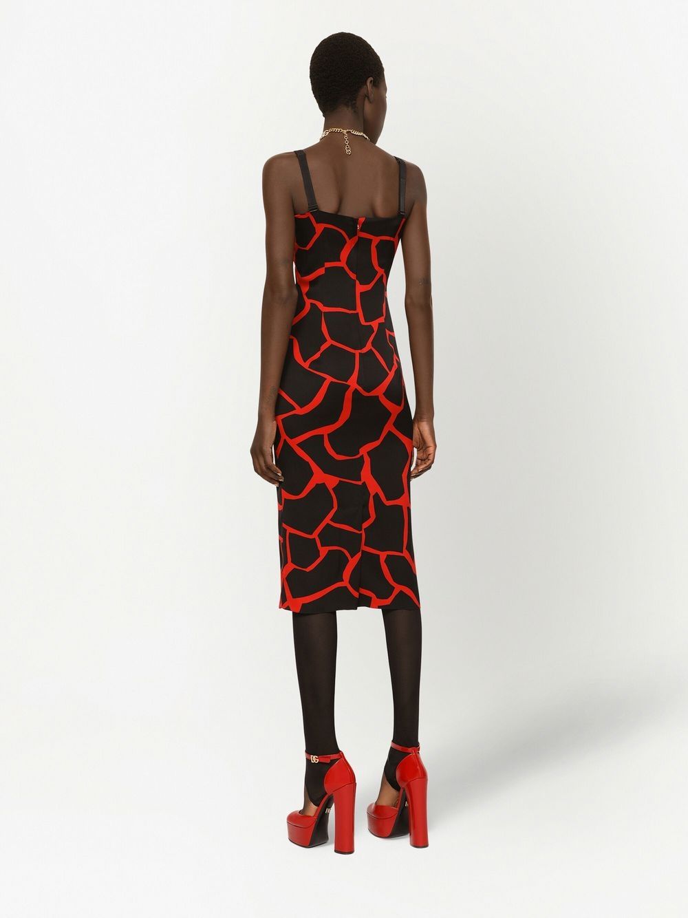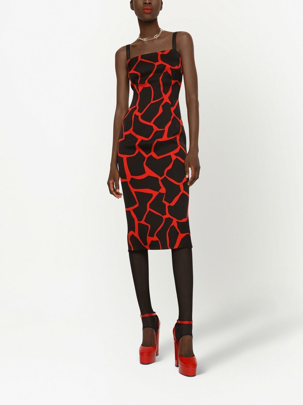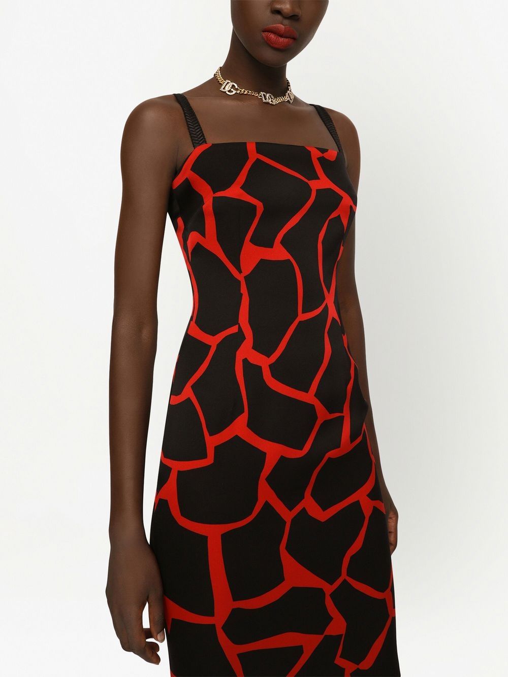 Reflecting the brand's bold take on garments, this Dolce & Gabbana dress boasts an all-over graphic pattern in a vibrant red hue on a black backdrop. It's complete with wide shoulder straps and a square neckline.