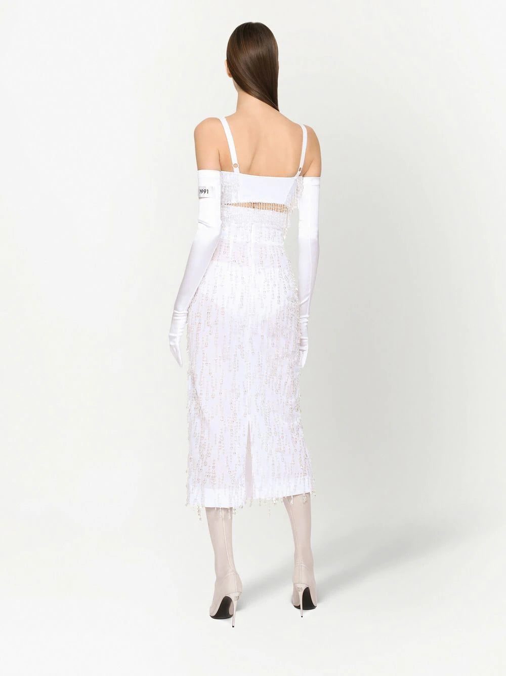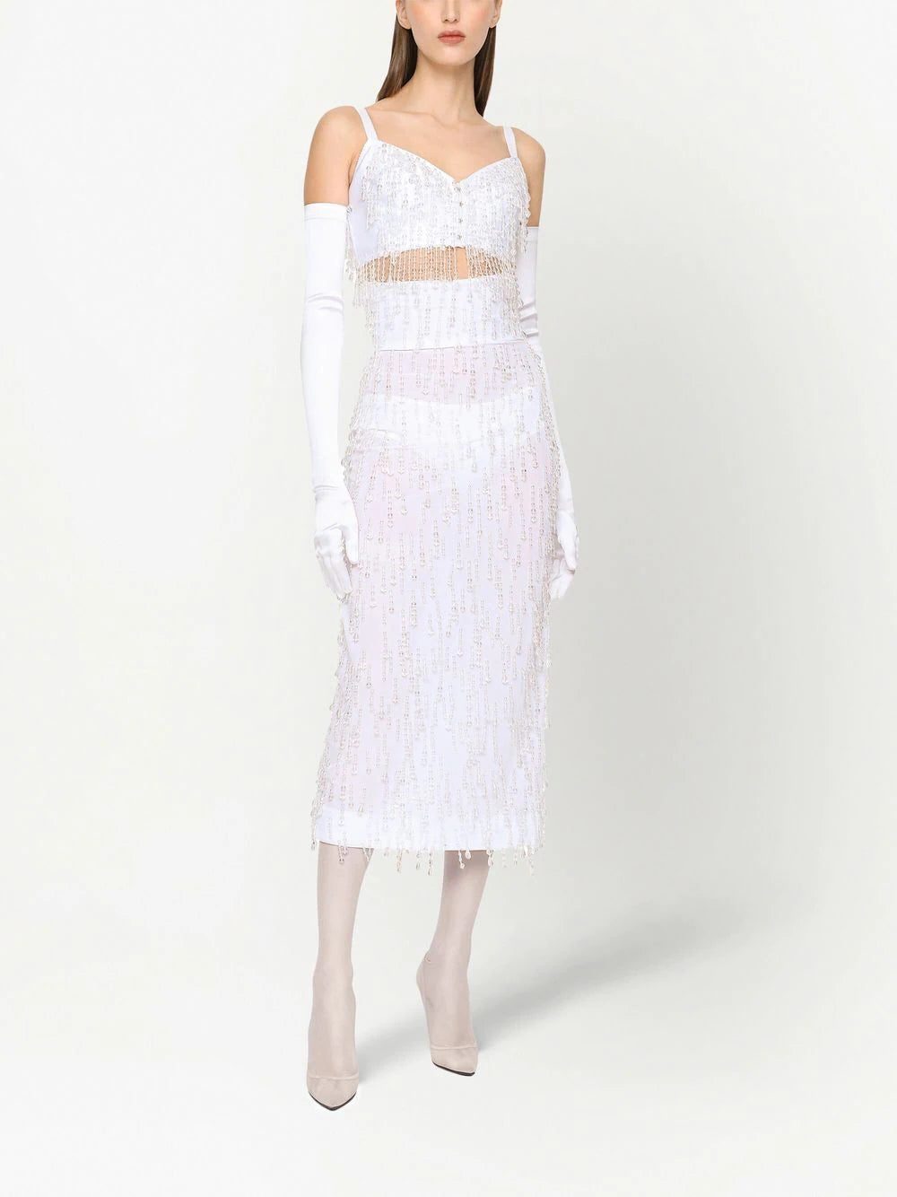 KIM DOLCE&GABBANA beaded fringe bustier top from DOLCE & GABBANA featuring white, silk blend, bead embellishment, fringe detailing, bustier-style neckline, hook and eye fastening and adjustable spaghetti straps.