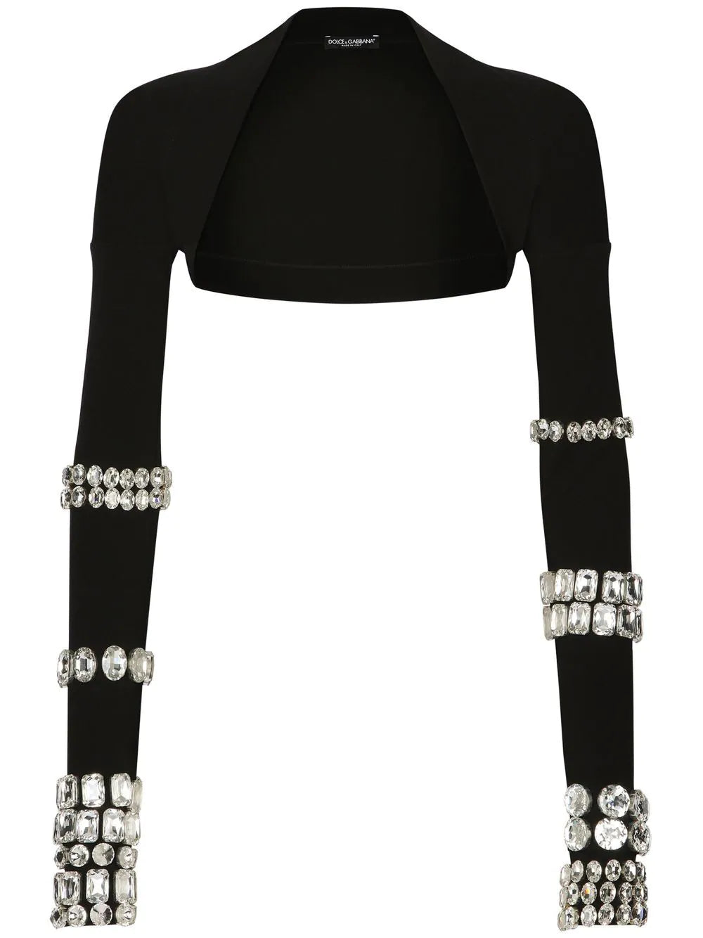KIM DOLCE&GABBANA crystal-embellished bolero from DOLCE & GABBANA featuring black, stretch-design, crystal embellishment, open front, cropped and long sleeves.