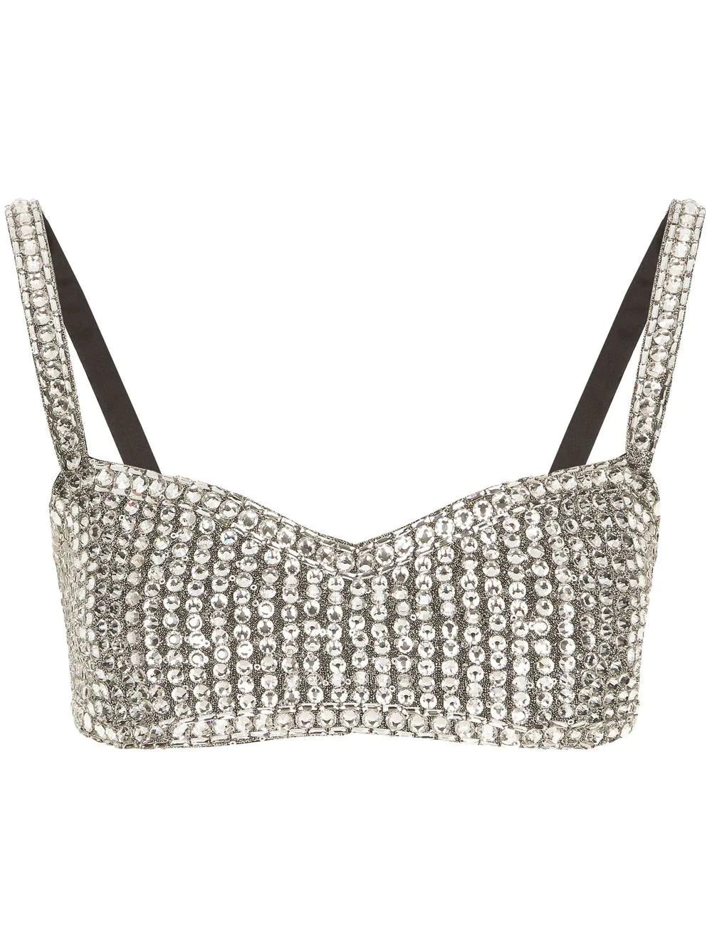 KIM DOLCE&GABBANA crystal-embellished bra top from DOLCE & GABBANA featuring silver-tone, silk blend, crystal embellishment, spaghetti straps, V-neck and rear zip fastening.