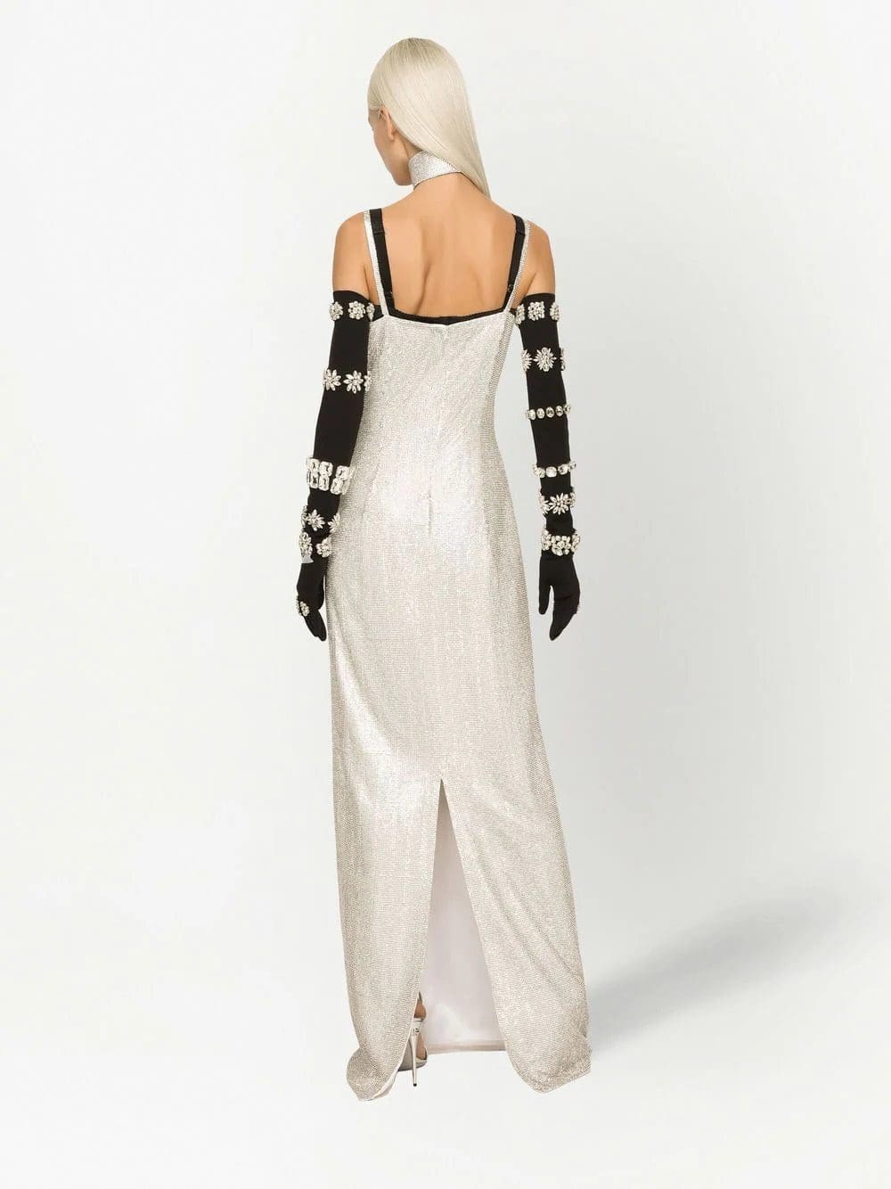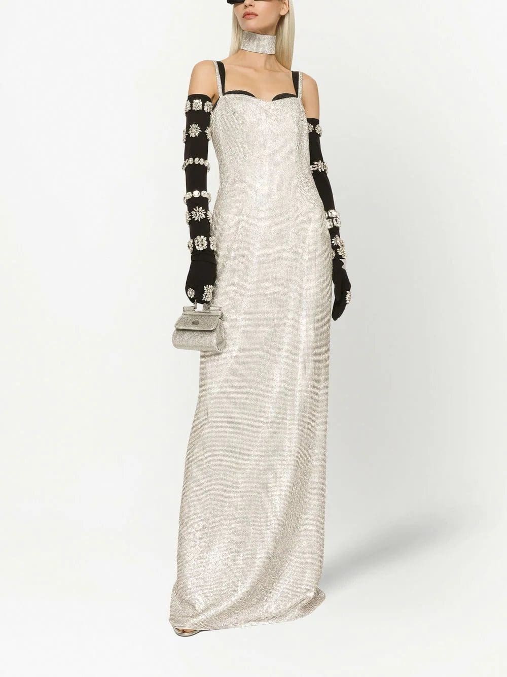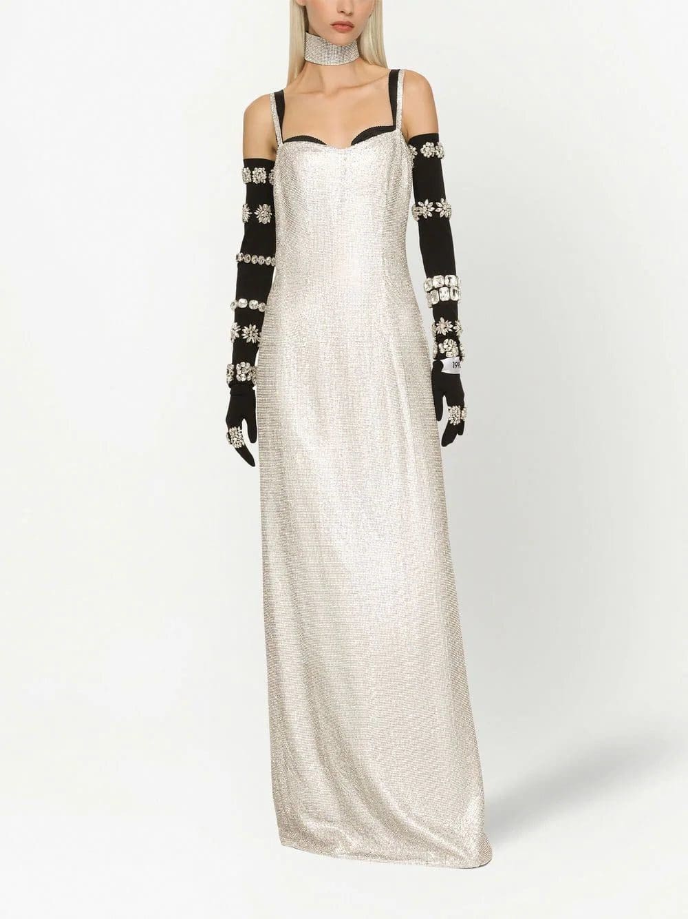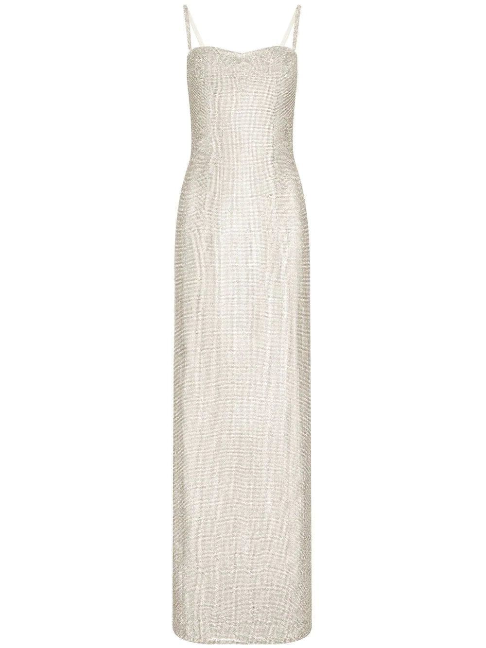 KIM DOLCE&GABBANA crystal-embellished floor length dress from DOLCE & GABBANA featuring white, silk, crystal, square neck, crystal embellishment, thin shoulder straps, floor-length and central rear vent.