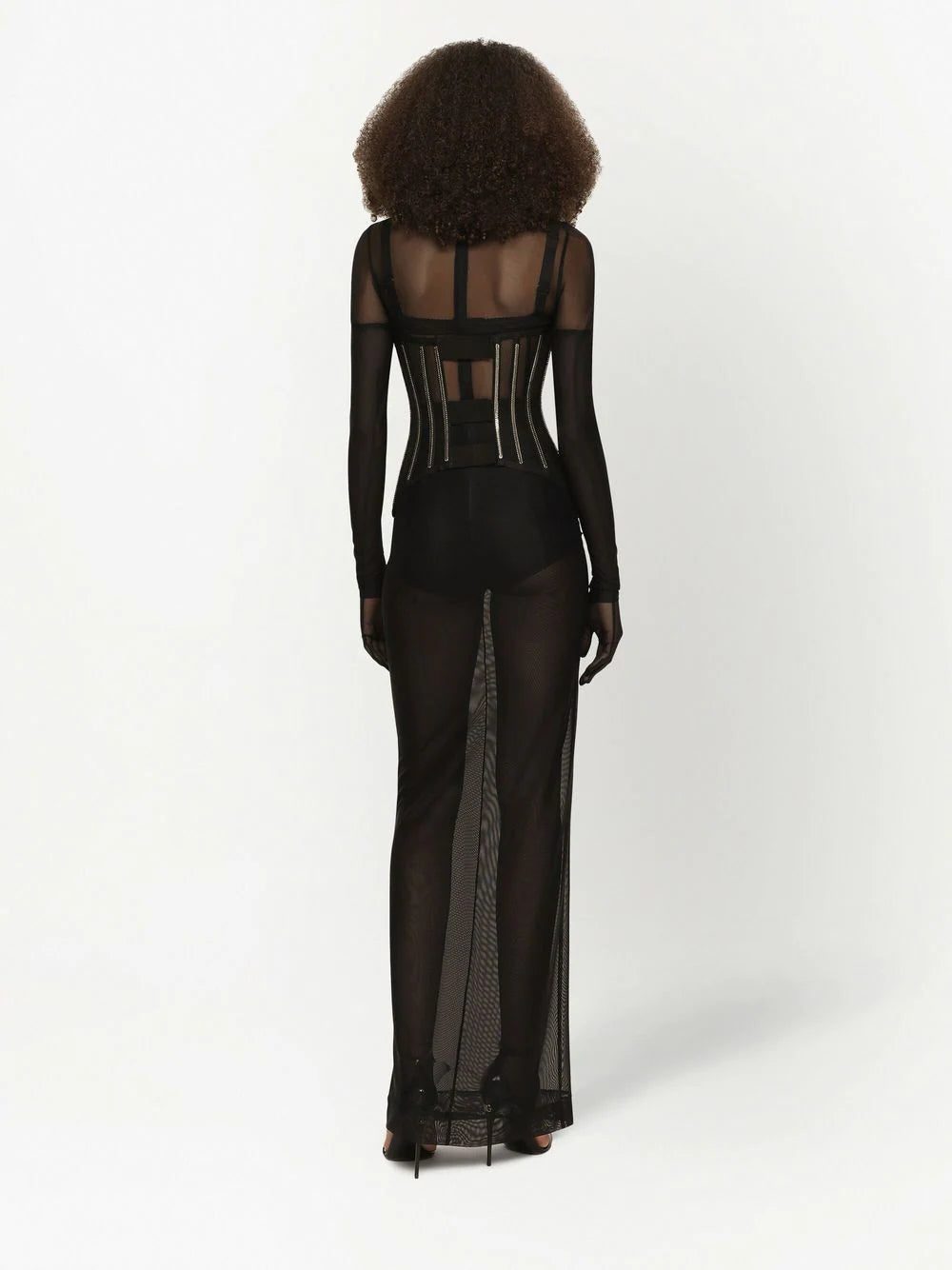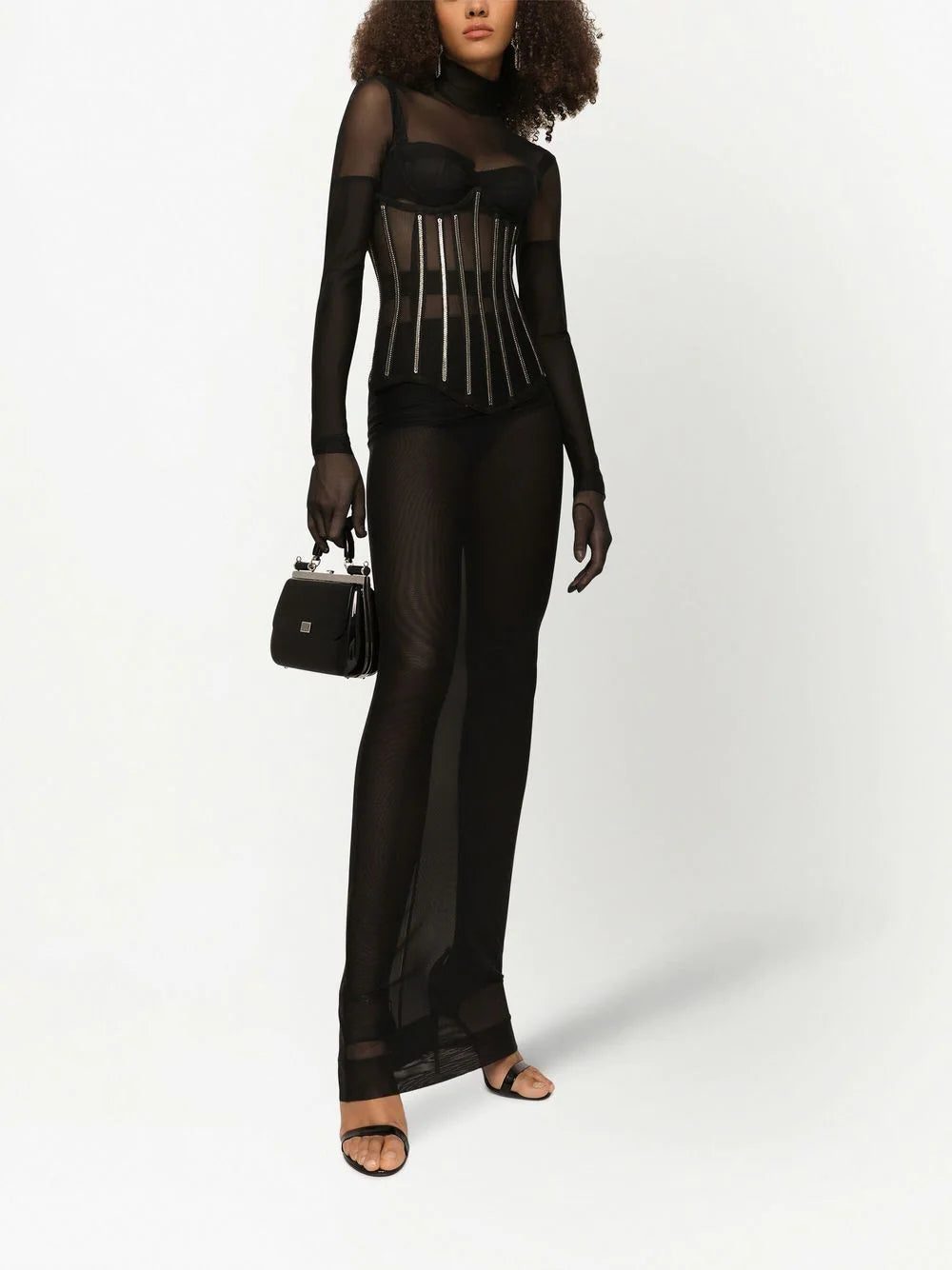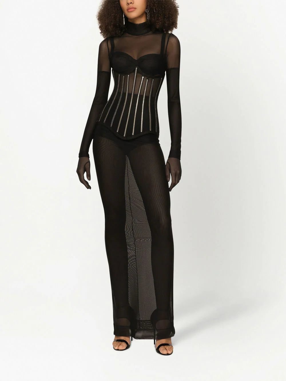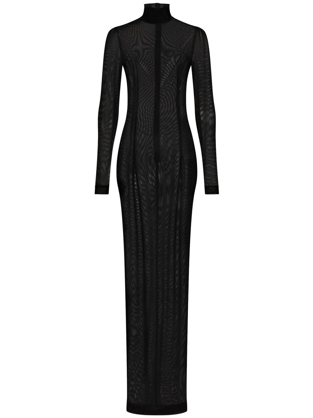 KIM DOLCE&GABBANA high-neck sheer floor length dress from DOLCE & GABBANA featuring black, silk blend, stretch-design, high neck, fitted waistline, long sleeves, central rear vent and floor-length.
