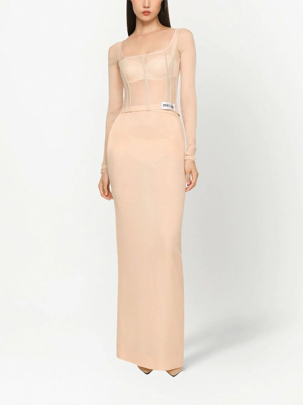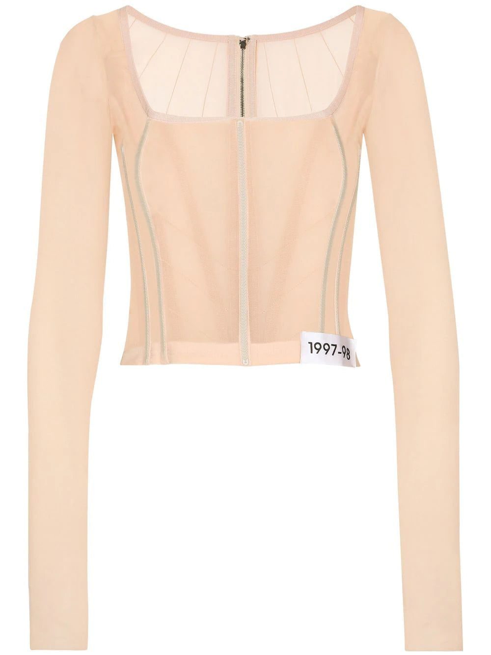 KIM DOLCE&GABBANA long-sleeve sheer corset top from DOLCE & GABBANA featuring blush beige, silk blend, sheer, corset style, boned bodice, number patch to the front, square neck, long sleeves and rear zip fastening.