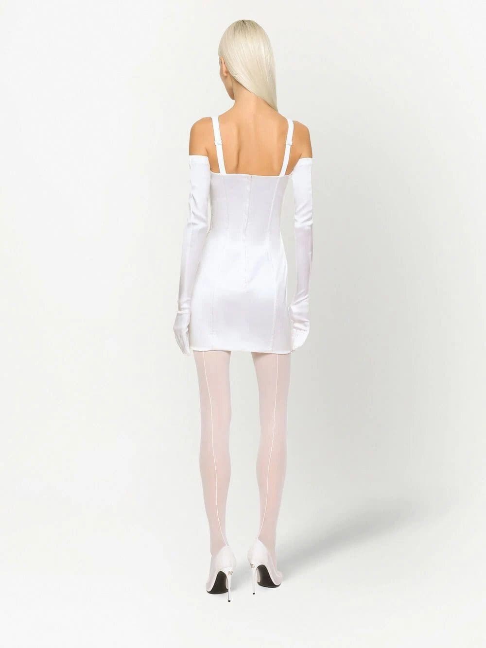 KIM DOLCE&GABBANA number-patch mini dress from DOLCE & GABBANA featuring optical white, number patch to the front, adjustable shoulder straps, moulded cup, underwire cup, boned bodice, thigh-length and rear zip fastening.