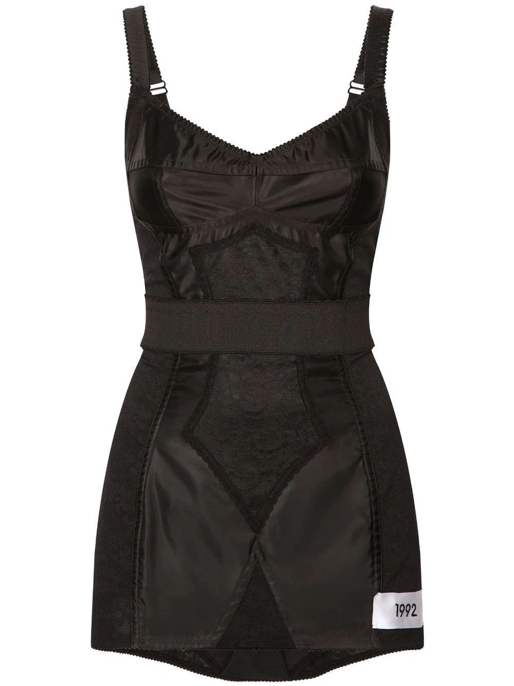 KIM DOLCE&GABBANA number-patch mini dress from DOLCE & GABBANA featuring black, stretch-design, contrasting panel detail, floral-lace detailing, sweetheart neck, fitted waistline, number patch to the front, two adjustable shoulder straps and thigh-length.