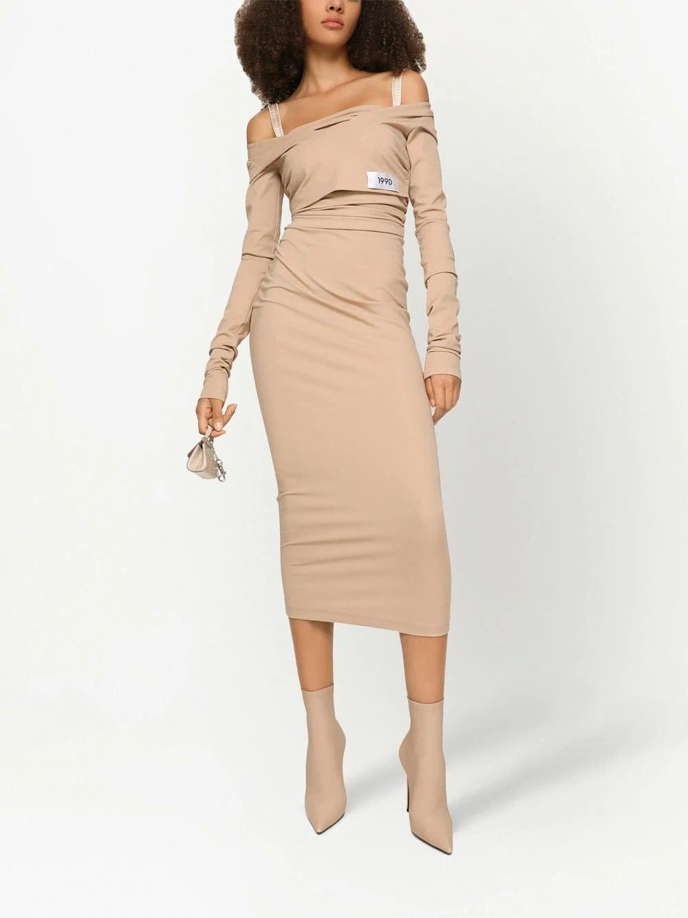 KIM DOLCE&GABBANA number patch off-shoulder dress from DOLCE & GABBANA featuring beige, stretch-design, off-shoulder, number patch to the front, long sleeves, central rear vent and calf-length.