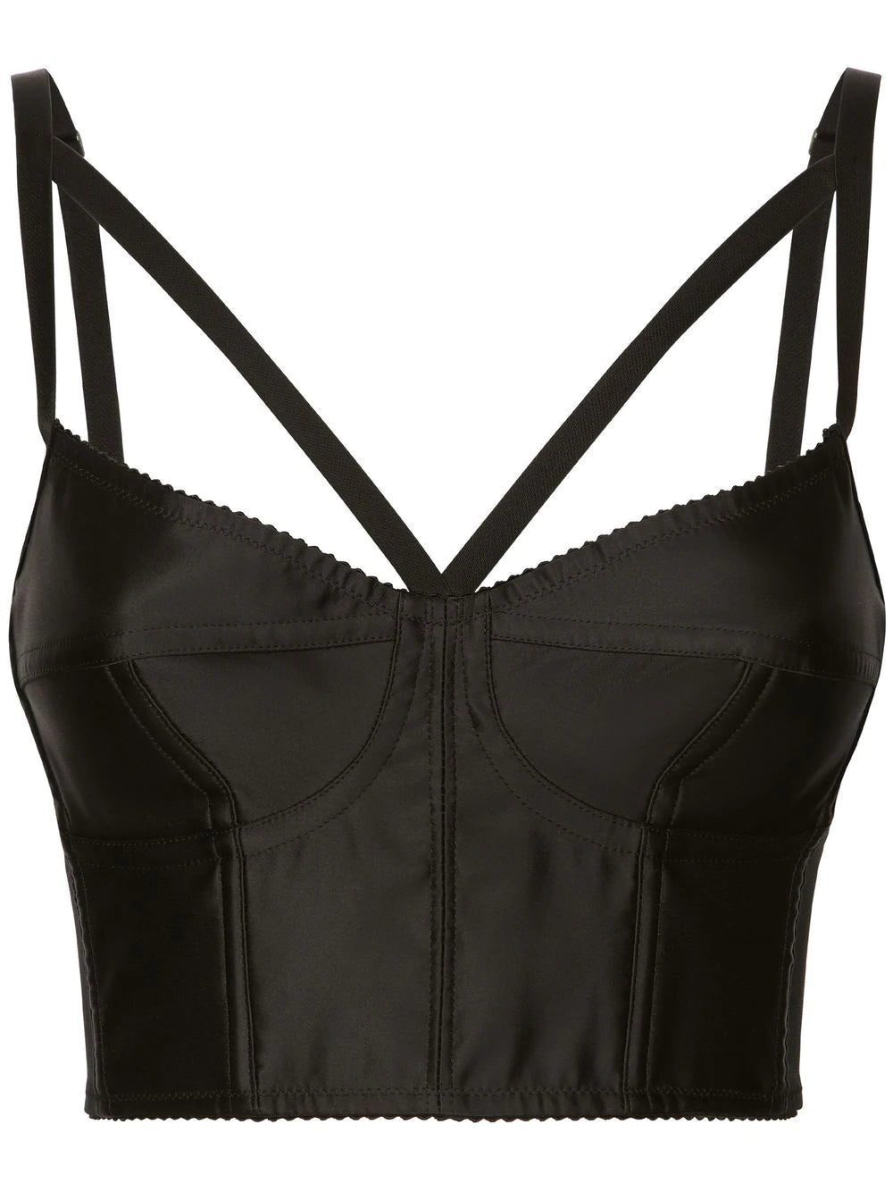 KIM DOLCE&GABBANA strap-detail bustier top from DOLCE & GABBANA featuring black, cotton, satin finish, strap detailing, moulded cup, bustier-style neckline, panelled design, adjustable spaghetti straps, hook and eye fastening and elasticated trim.