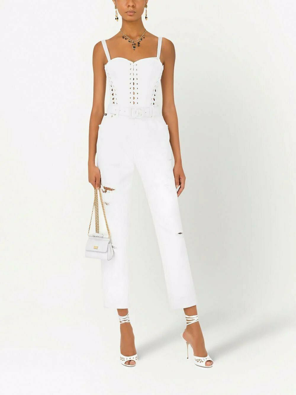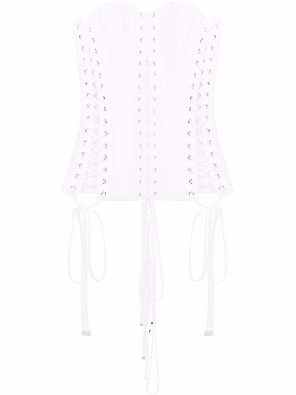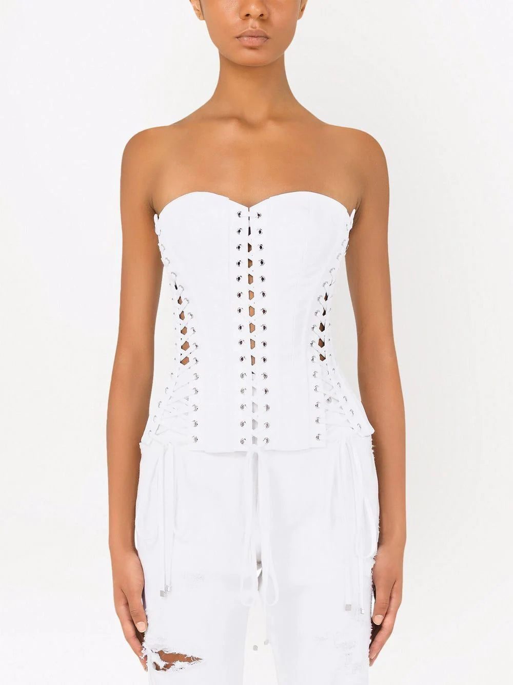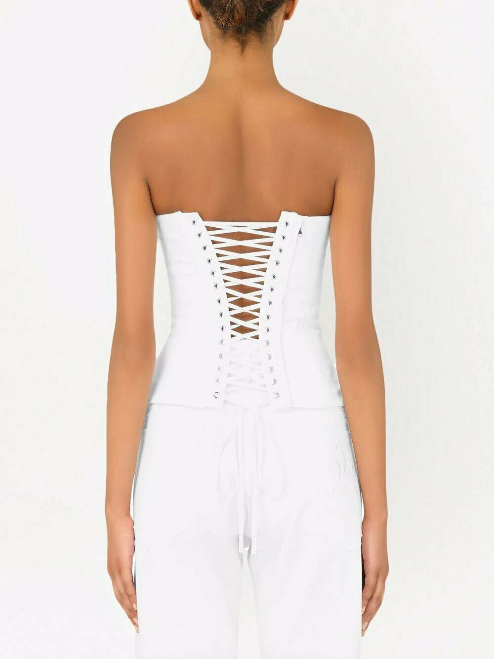 Optical white cotton lace-detail cotton corset from DOLCE & GABBANA featuring panelled design, lace-up detailing, sweetheart neck, sleeveless and straight hem.
