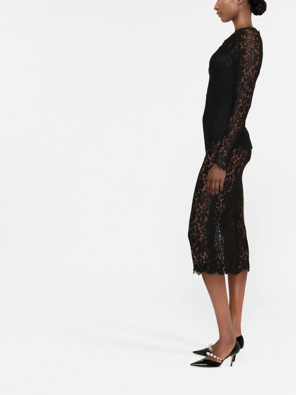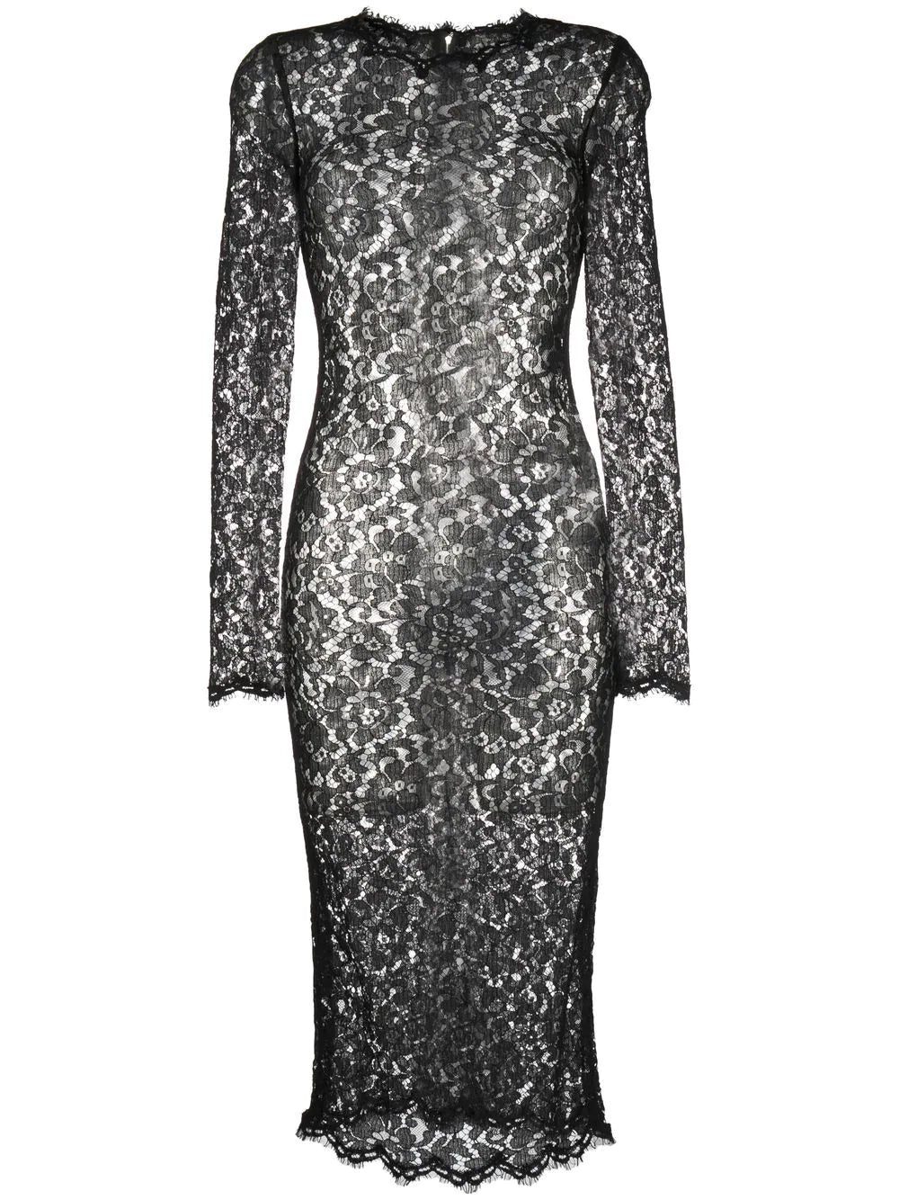 layered lace midi dress from DOLCE & GABBANA featuring double layer, floral-lace detailing, jet black, cotton, round neck, long sleeves and mid-length.