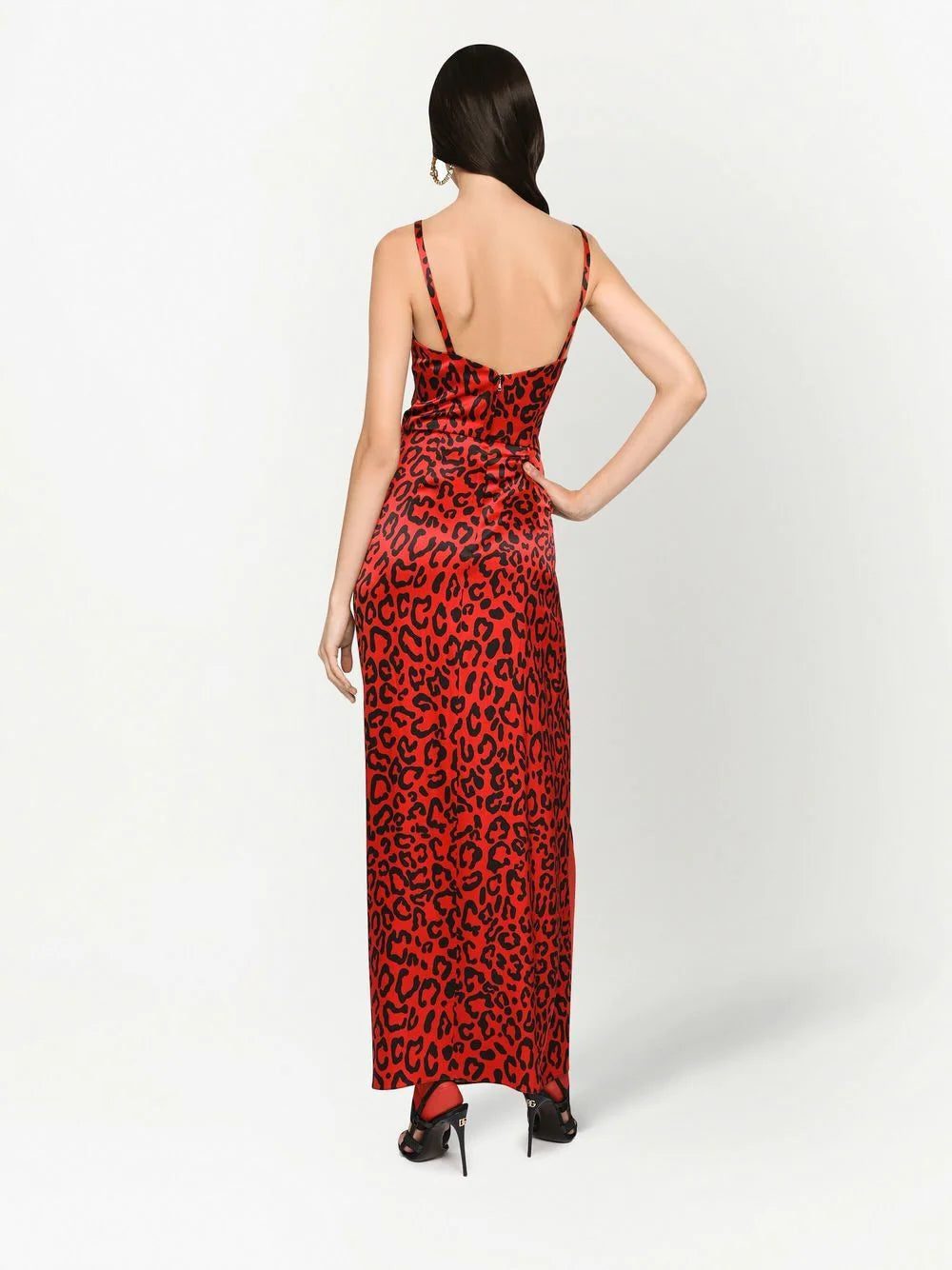 Dolce & Gabbana's dramatic design aesthetic is underpinned by its use of vibrant patterns. This lustrous silk satin maxi dress is patterned with red and black leopard spots that work their way around the gently gathered silhouette.