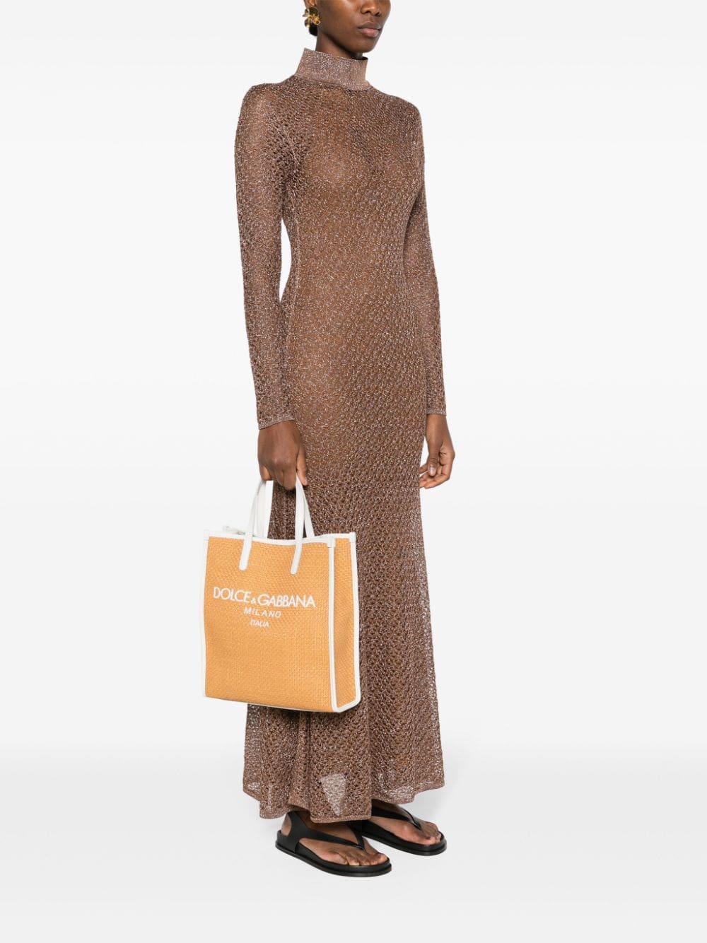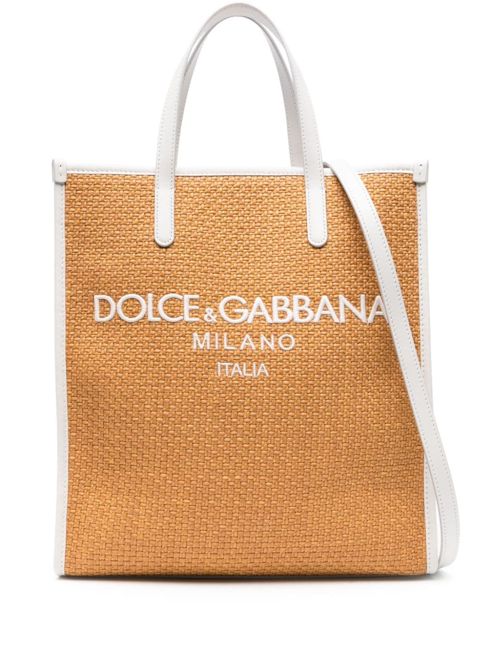 Dolce & Gabbana's take on the classic shopper bag features a woven design. It's crafted from raffia and embroidered with white logo lettering to match the leather handles and trims.