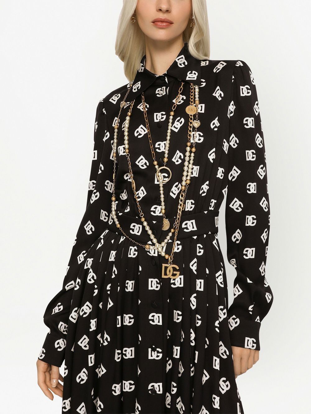 Crafted from silk, this Dolce & Gabbana dress boasts contrast white DG logo branding all-over and is complete with gathered detailing for a bold look.