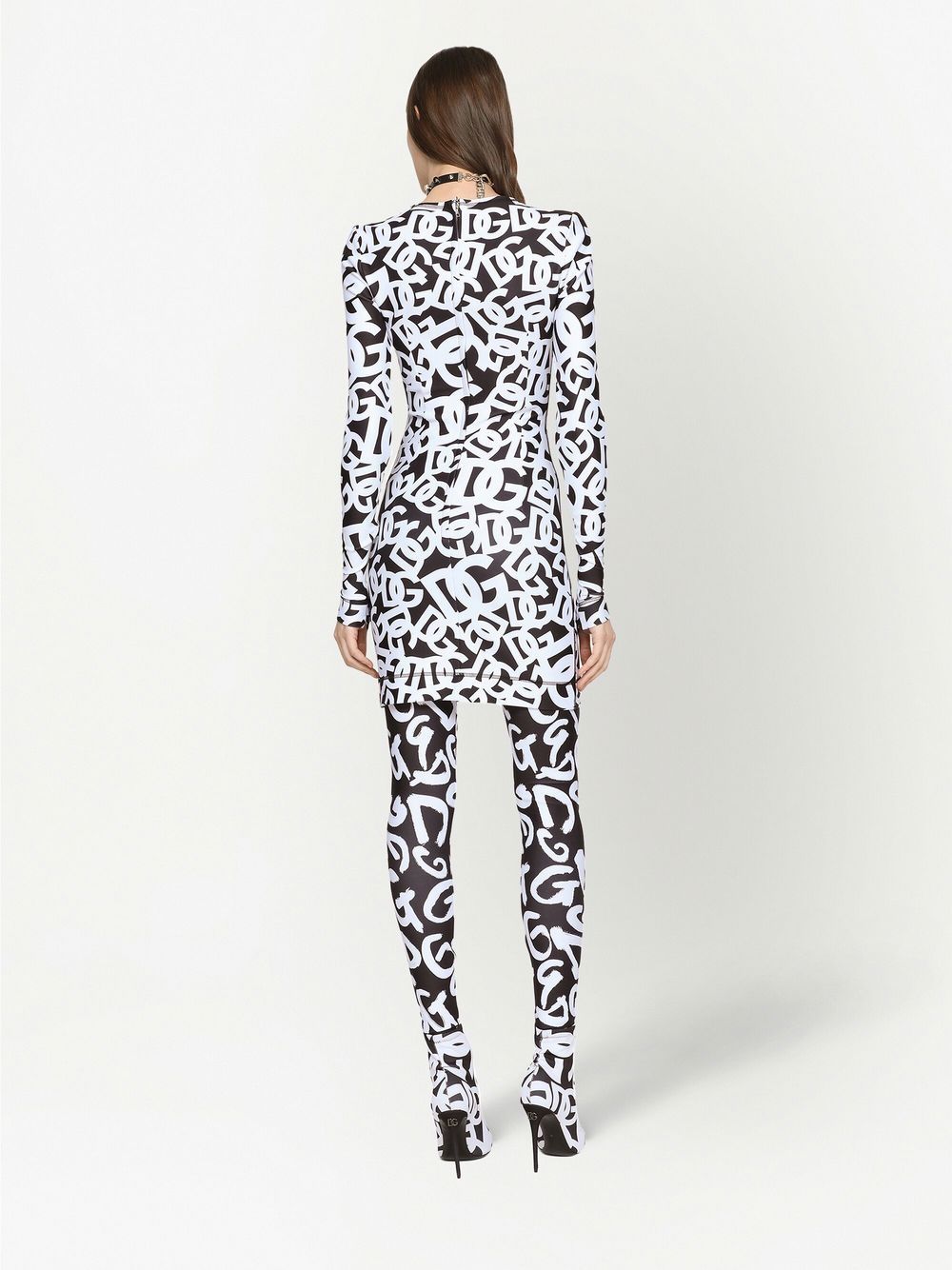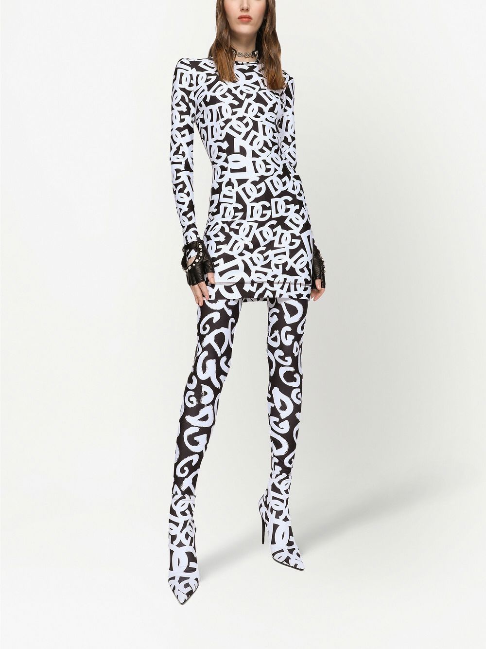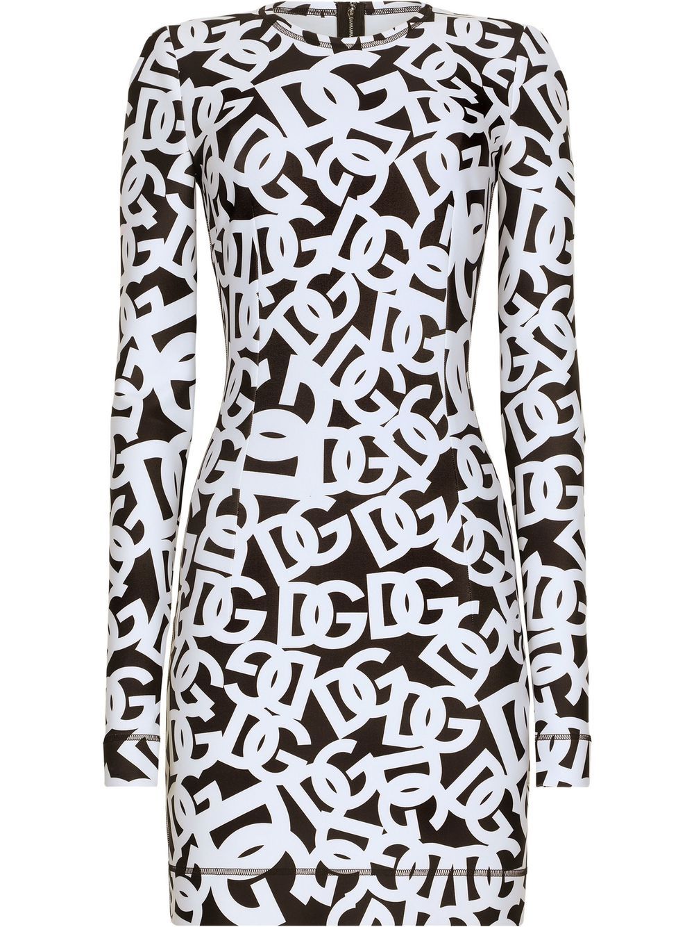 black/white stretch-design all-over logo print round neck long sleeves above-knee length straight hem