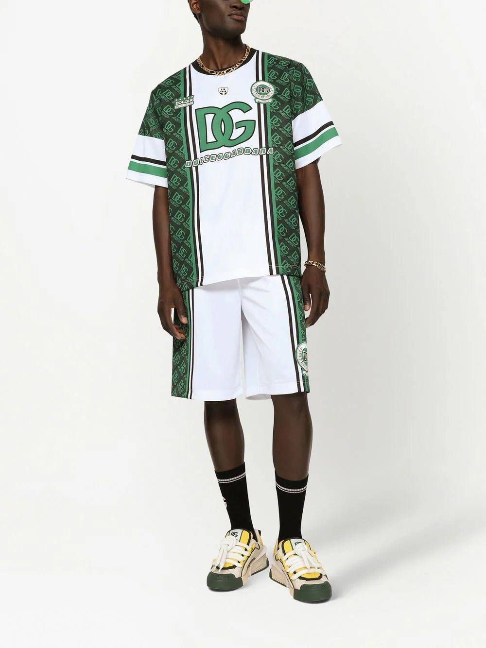 fern green/optical white lightweight construction colour-block panelled design logo print to the front signature DG monogram print stripe print number print to the rear crew neck short sleeves straight hem