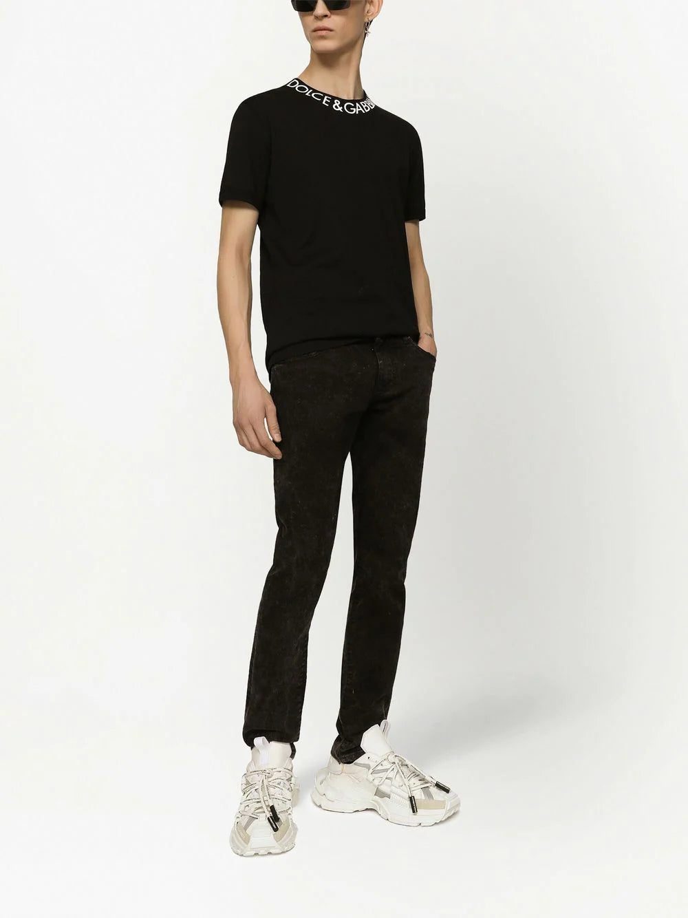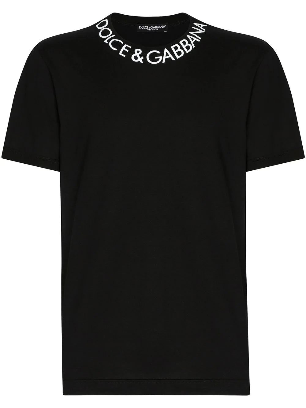 logo-print neckline T-shirt from DOLCE & GABBANA featuring jersey knit, logo print at the neckline, crew neck, short sleeves, straight hem, black/white and cotton.
